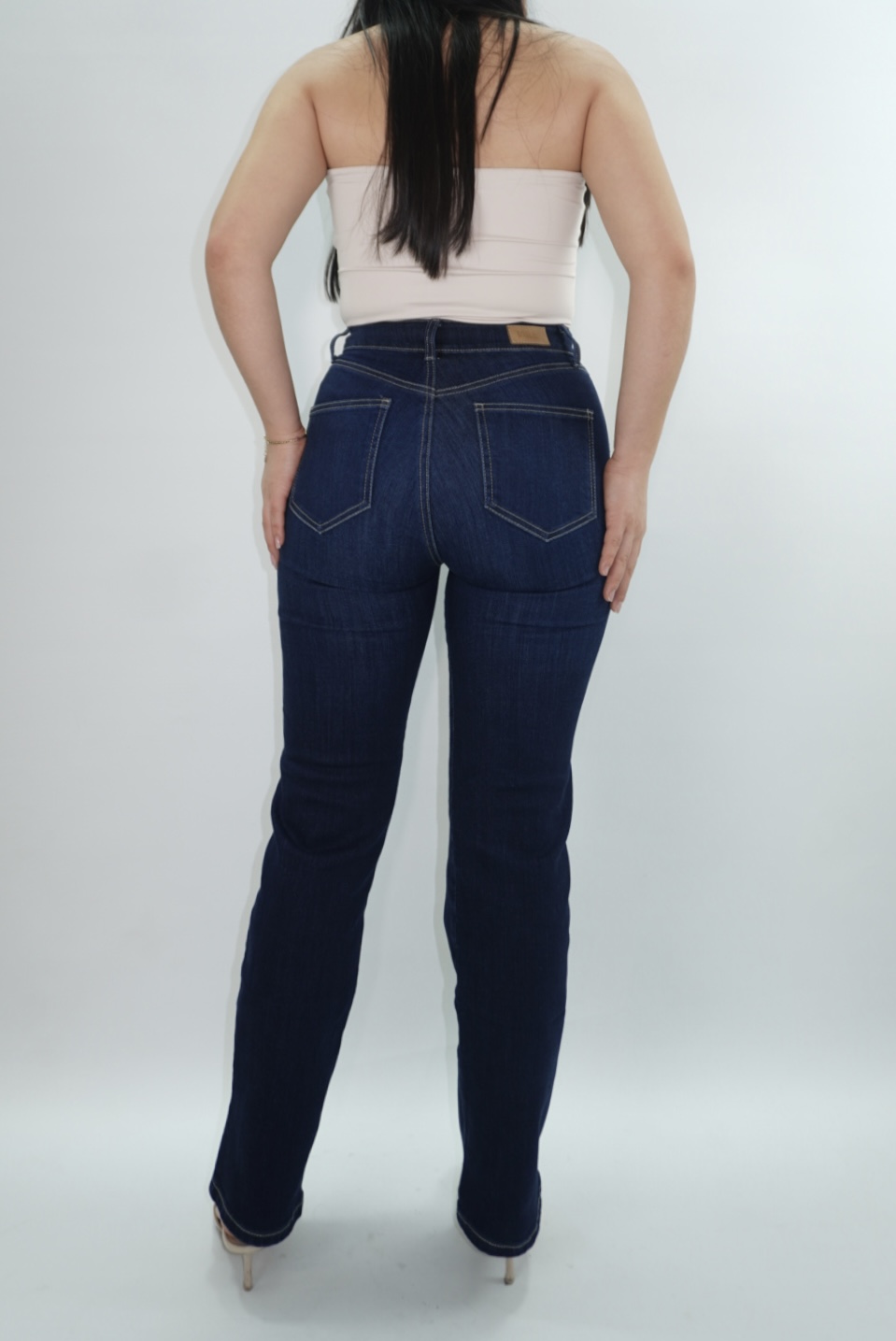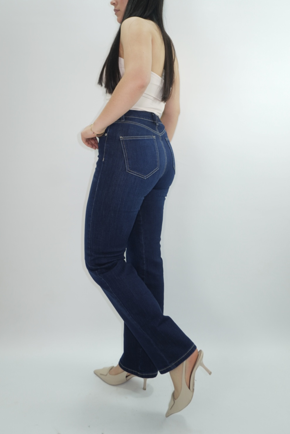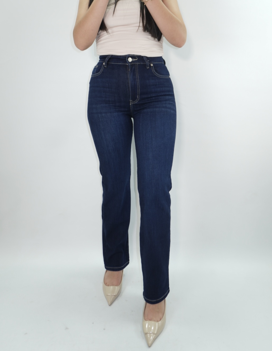 Slim Fit en color azul oscuro tela stretch, ceñido en cintura y cadera, basta semitubo y tiro alto.