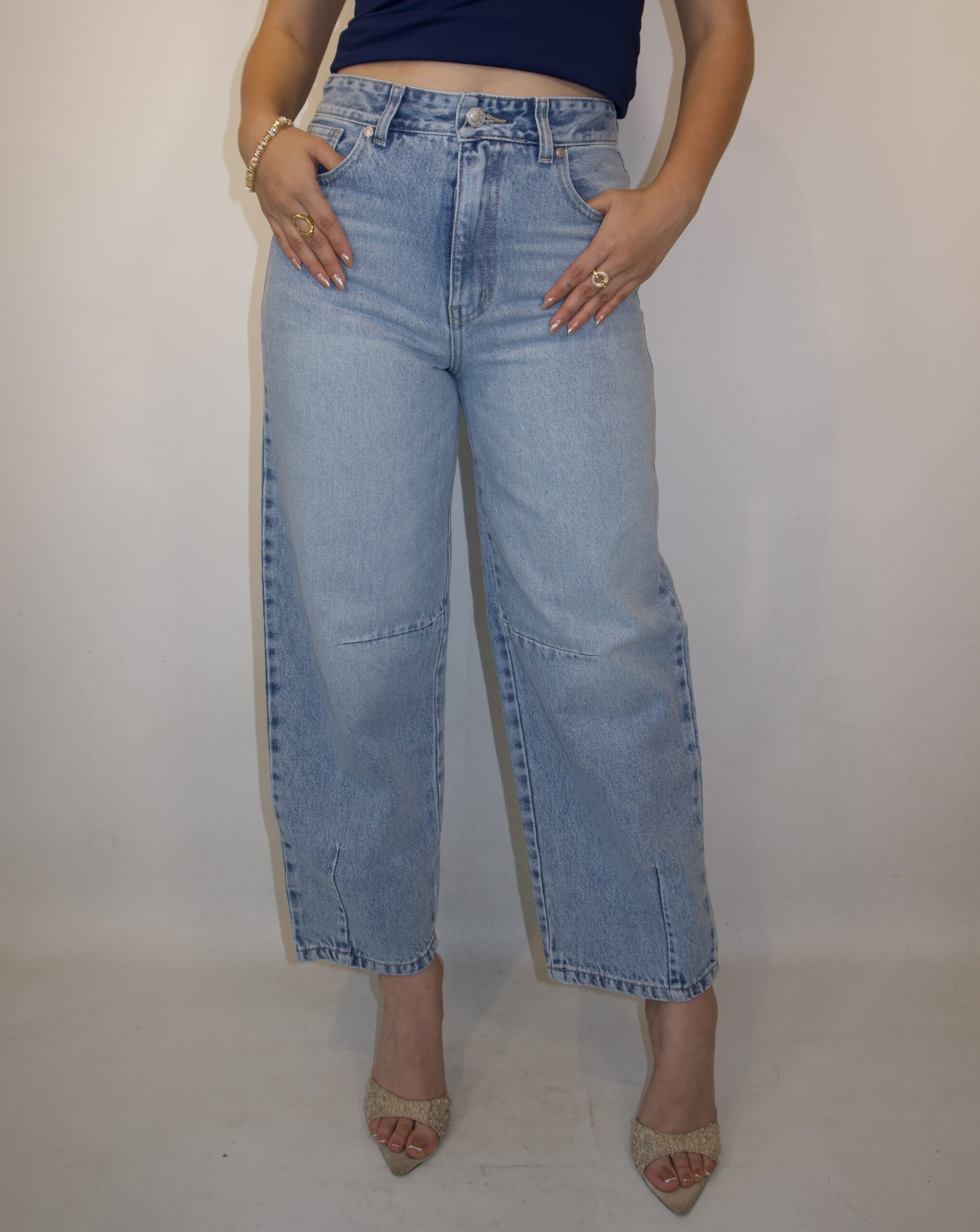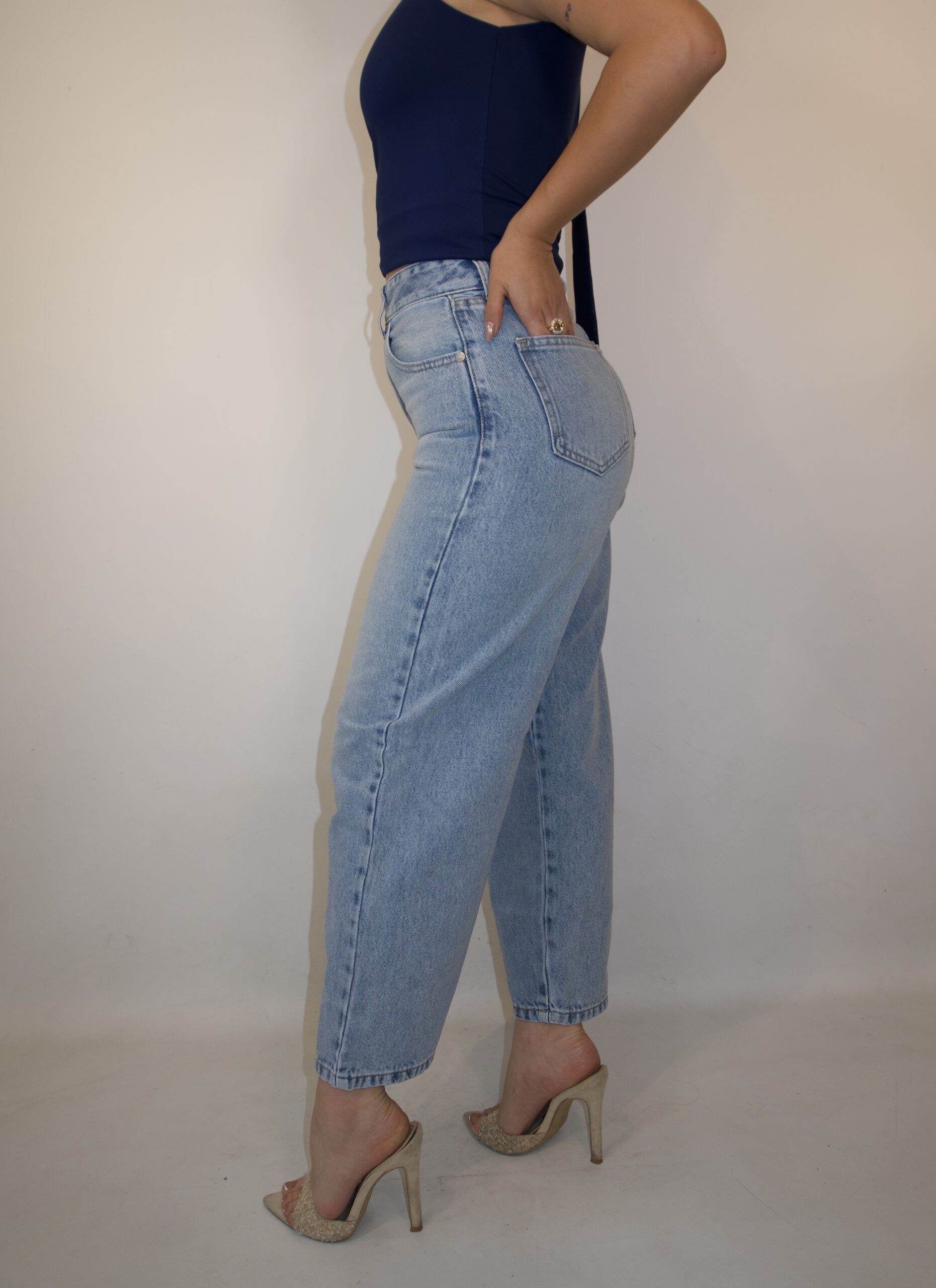 Ballon Jean en azul claro, en tela rígida y con detalle de costura al frente. Tela rígida con terminación en basta más ajustada.