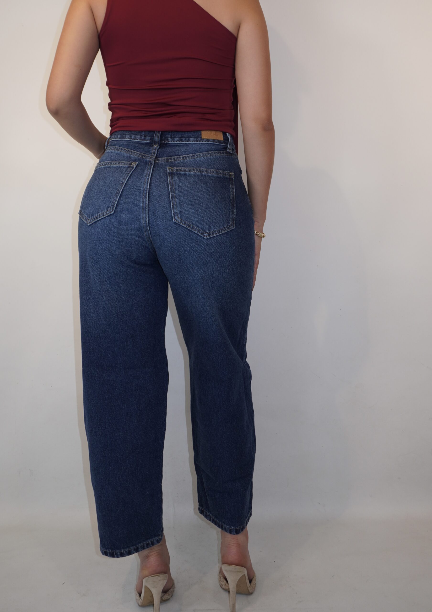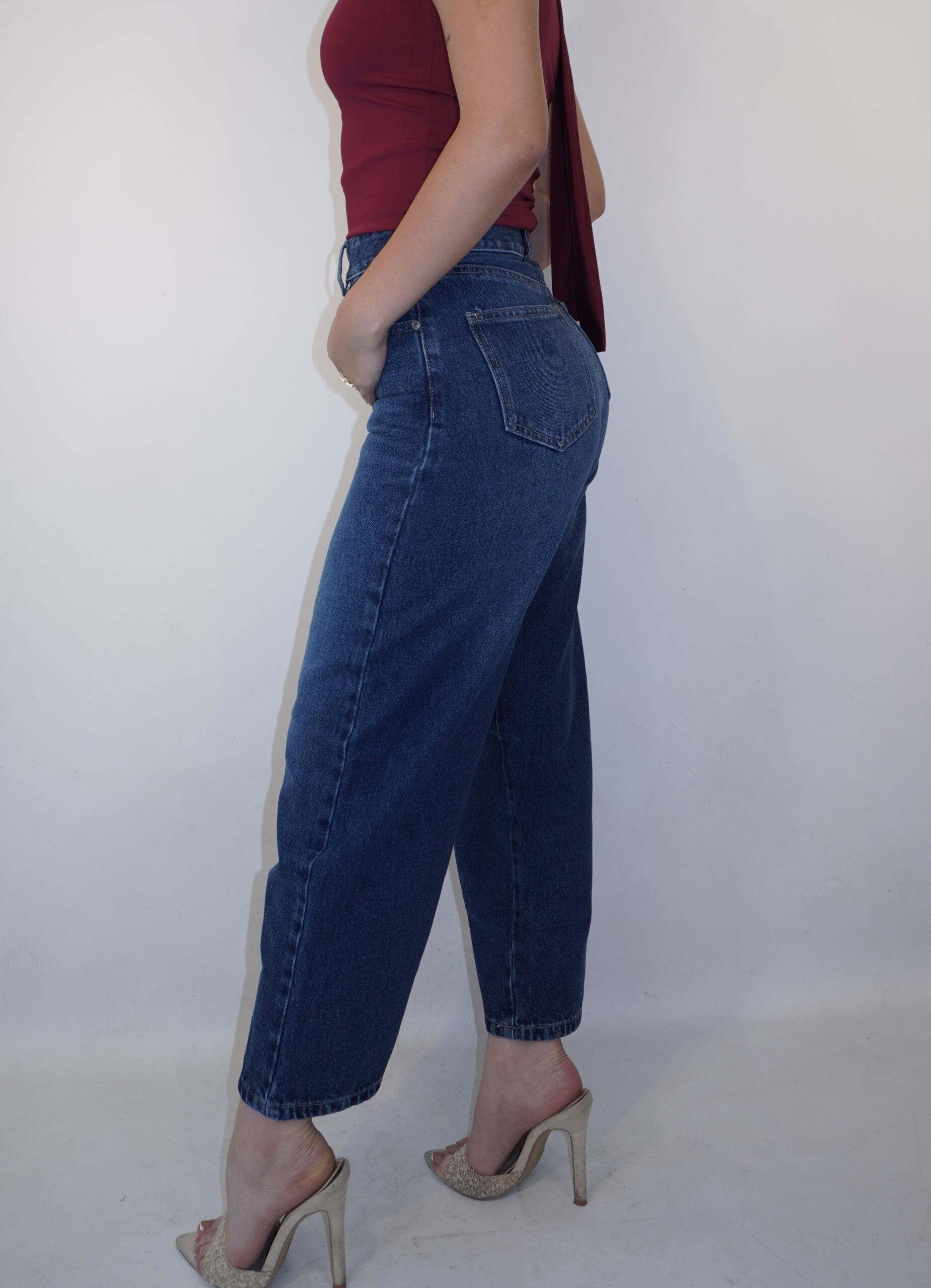 Ballon Jean en azul oscuro, en tela rígida y con detalle de costura al frente. Tela rígida con terminación en basta más ajustada.
