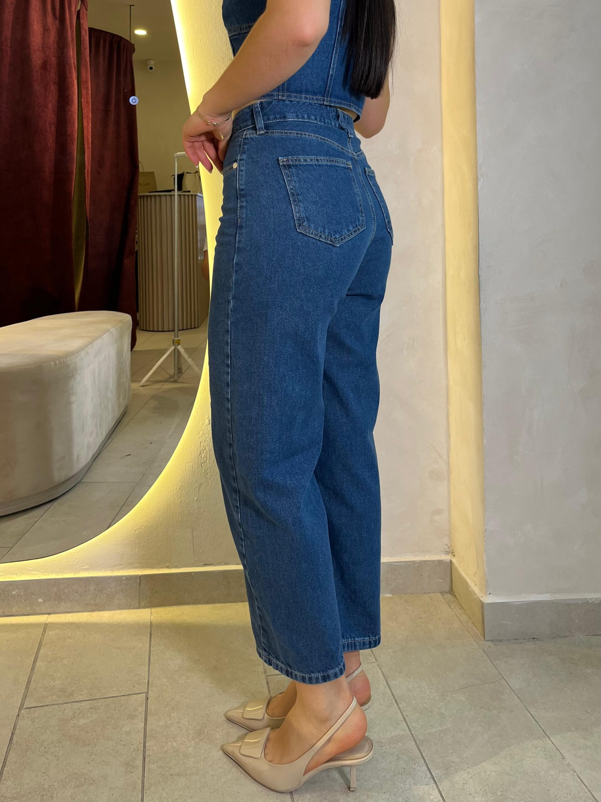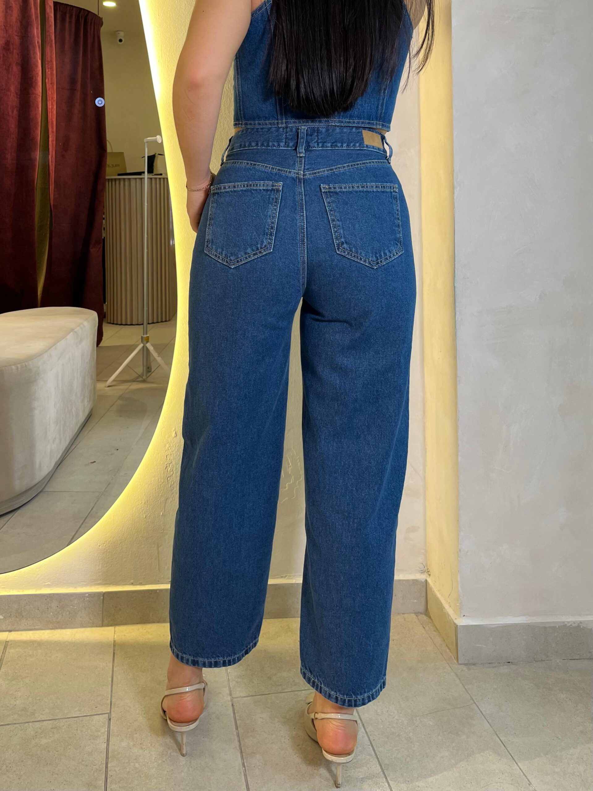 Balloon jean, tiro alto, azul medio, tela rígida 100% algodón, con silueta amplia en piernas y con efecto globo.
