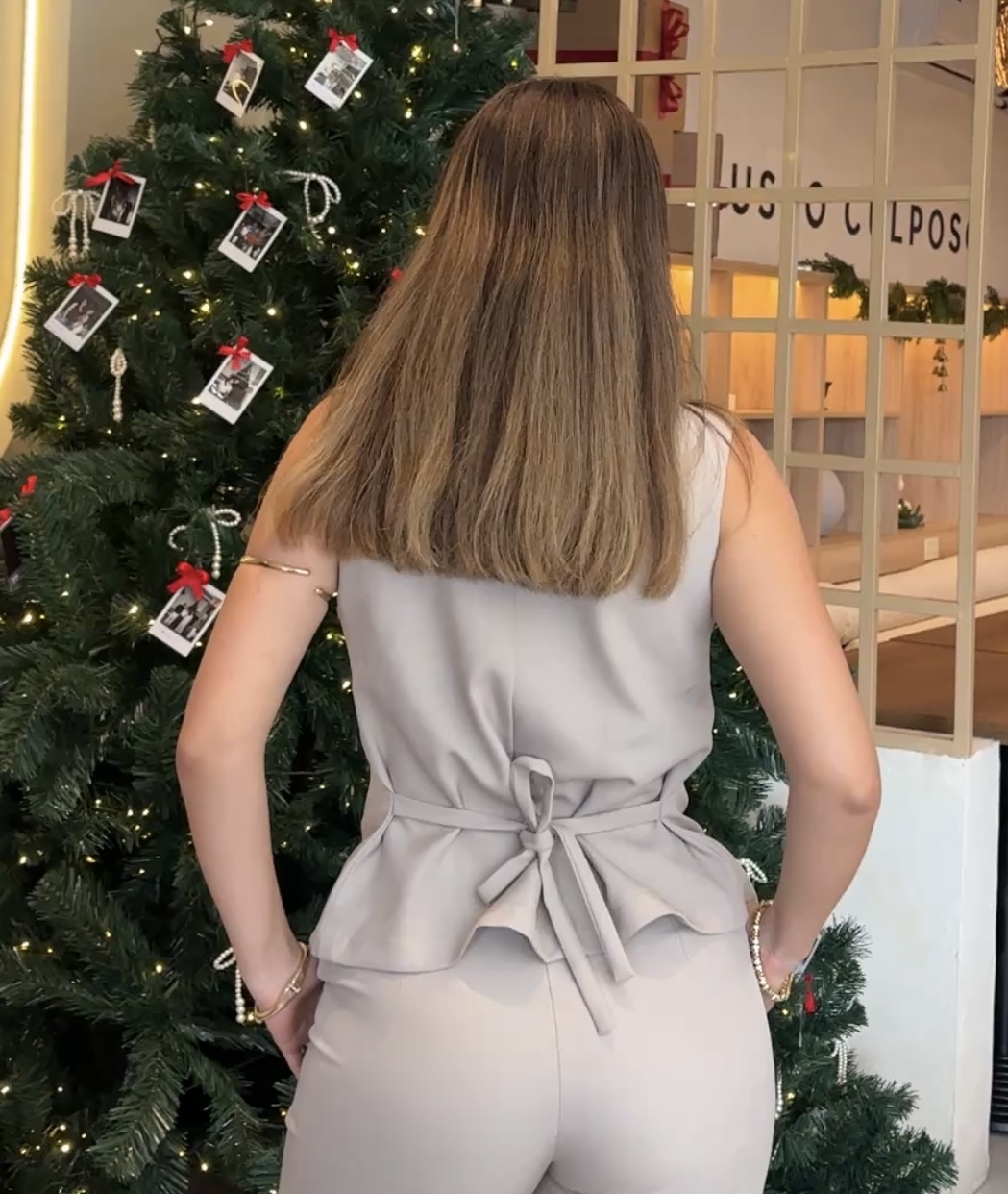 Chaleco con diseño cruzado frontal y escote en V. Cuenta con tiras ajustables a la cintura.