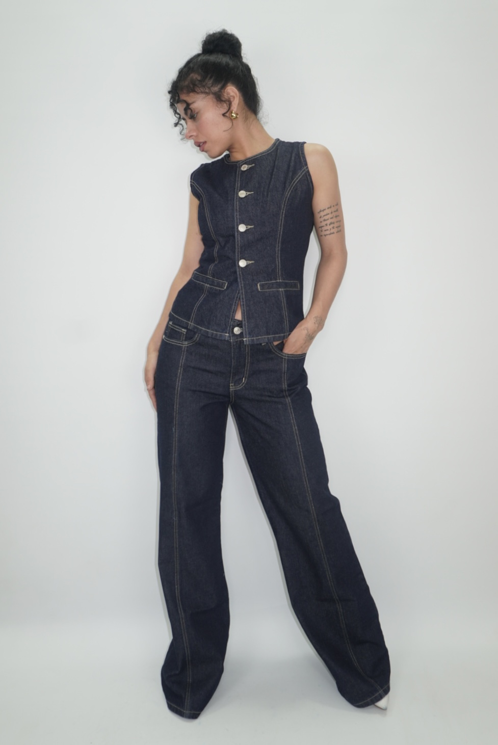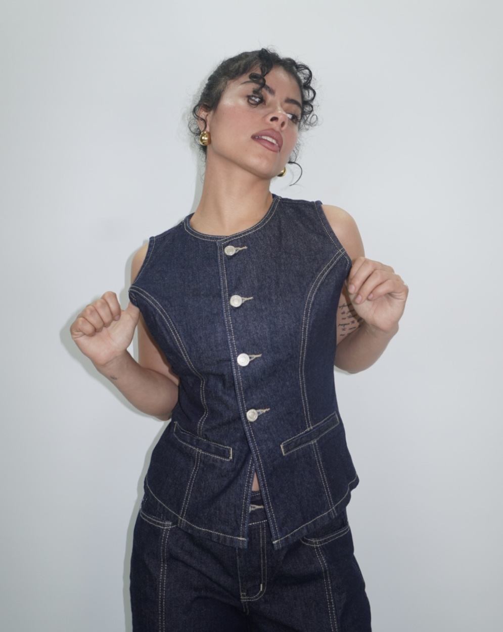 Chaleco jean, color azul natural , con botones frontales, con diseño que simula bolsillos y pinzas.