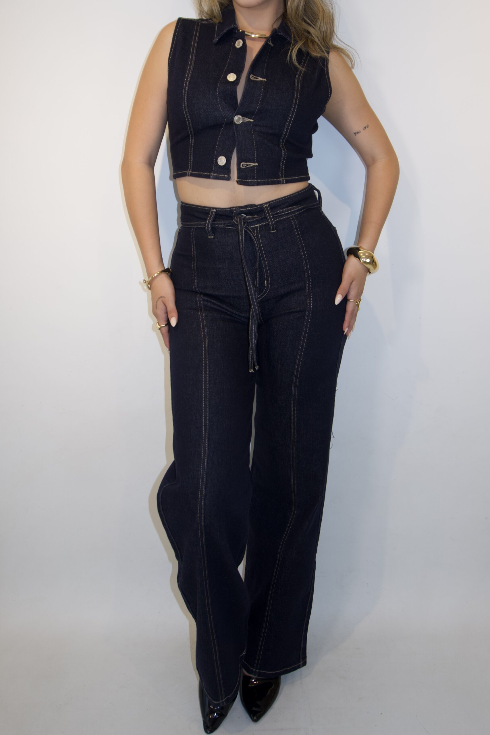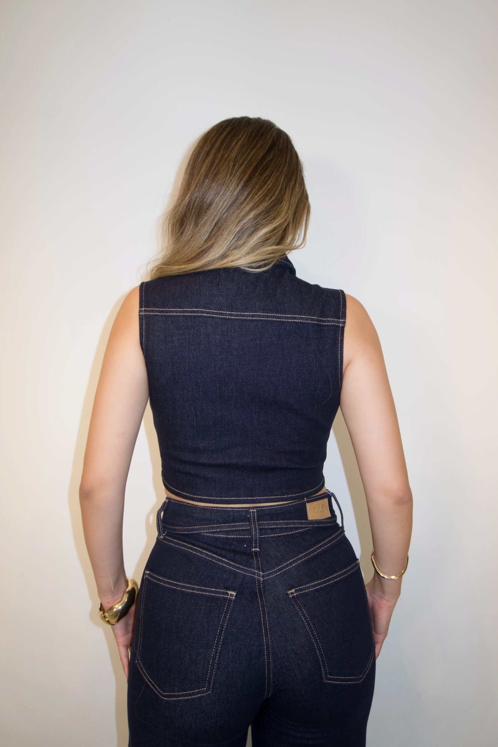 Chaleco con solapa en tela denim y stretch. Tono azul natural con detalle de costuras al frente.