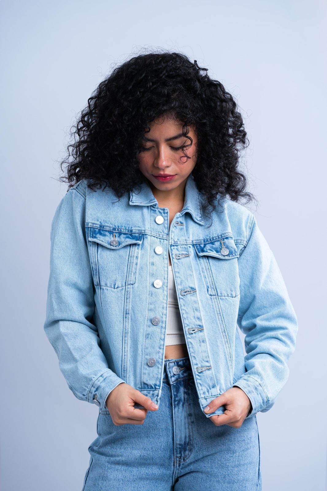 Chaqueta jean, tela rígida, 100% algodón, color azul claro, corte termina en cadera alta, con botones.