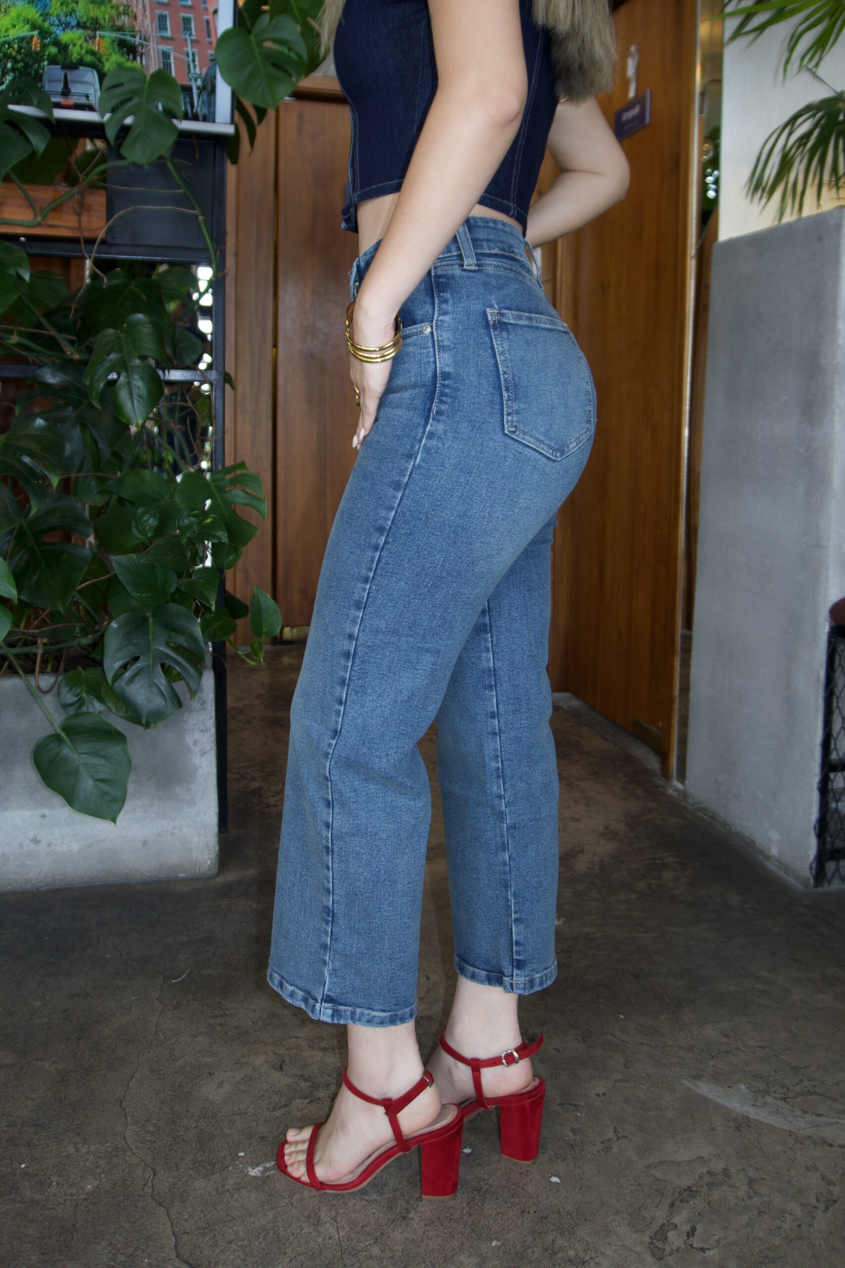 Culotte Jean en tela stretch, tiro alto y ceñido en cadera. Largo llega hasta el tobillo, basta ancha.