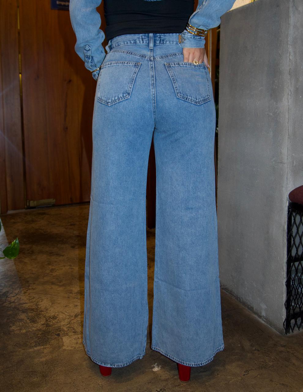 Jean en corte Palazzo en tela liviana 100% algodón. Tiro alto en basta ancha.