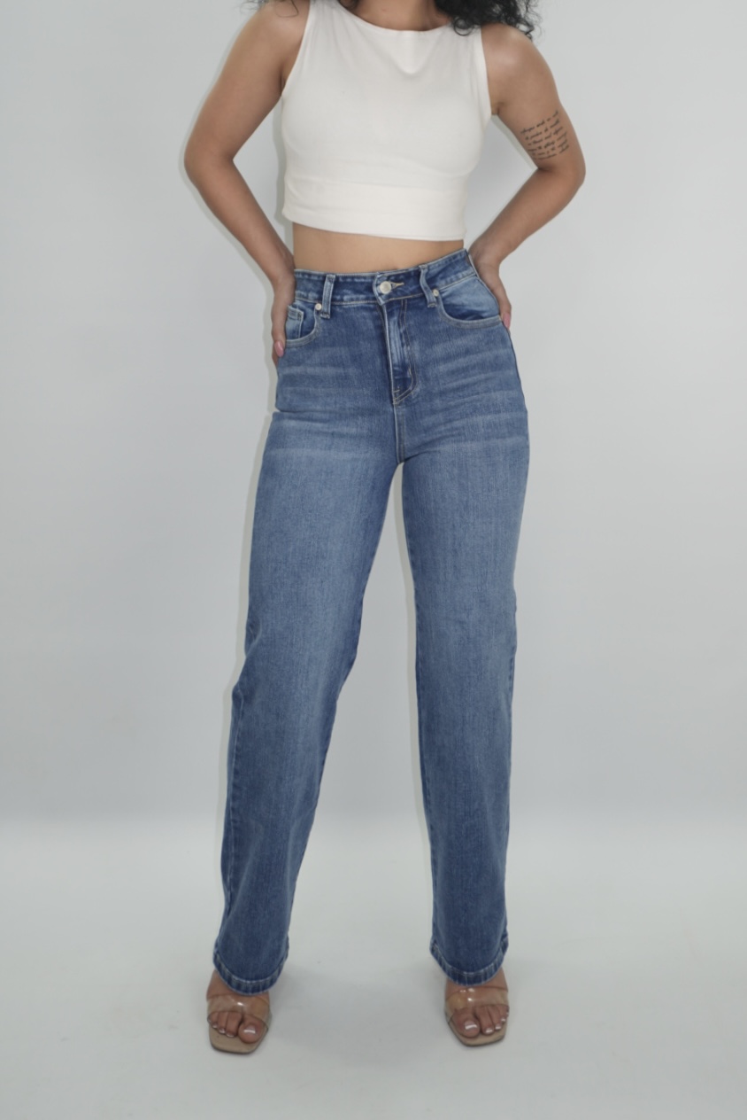Jean Recto en tiro alto, corte recto, ceñido a la figura en color azul claro.
