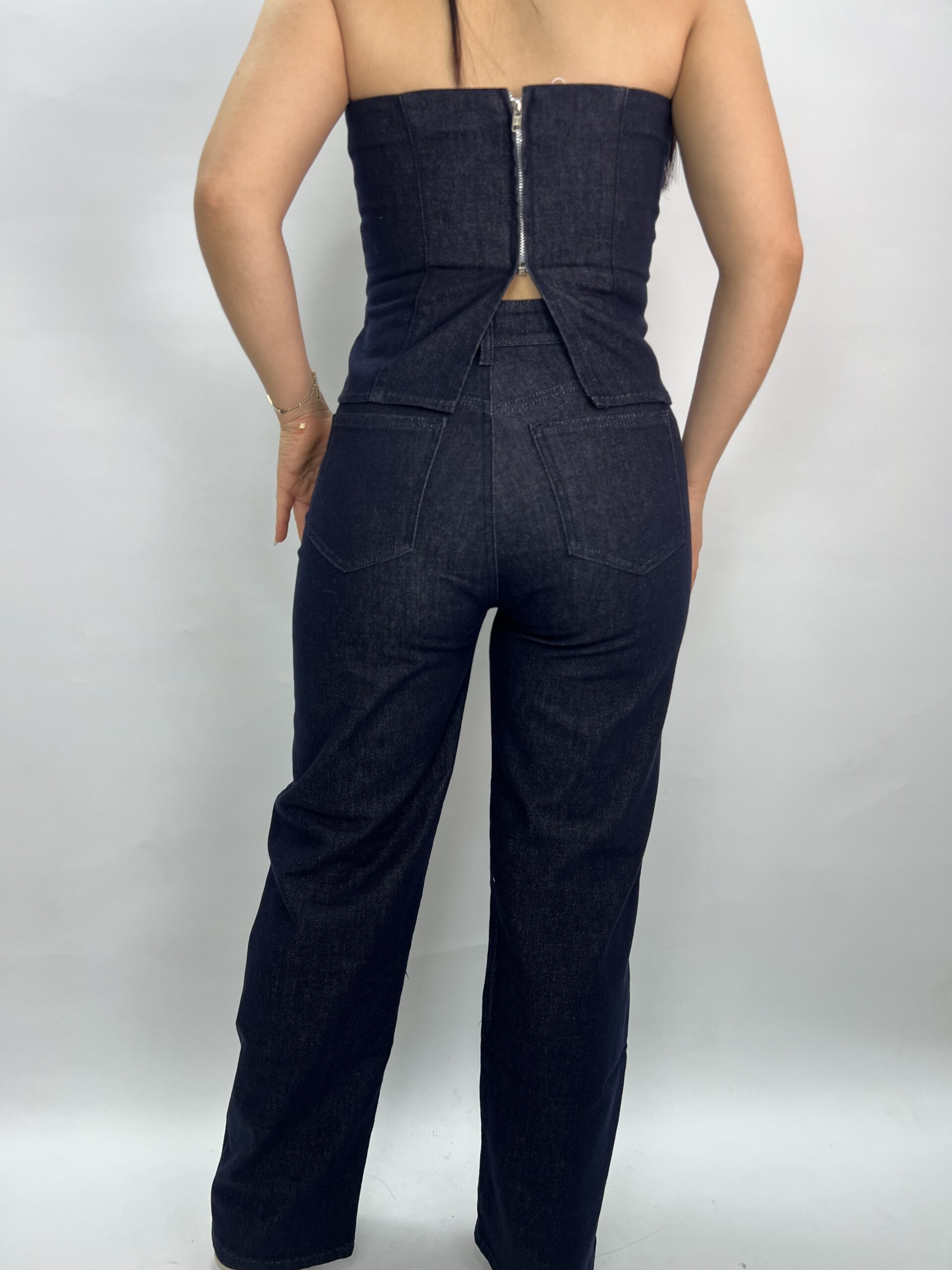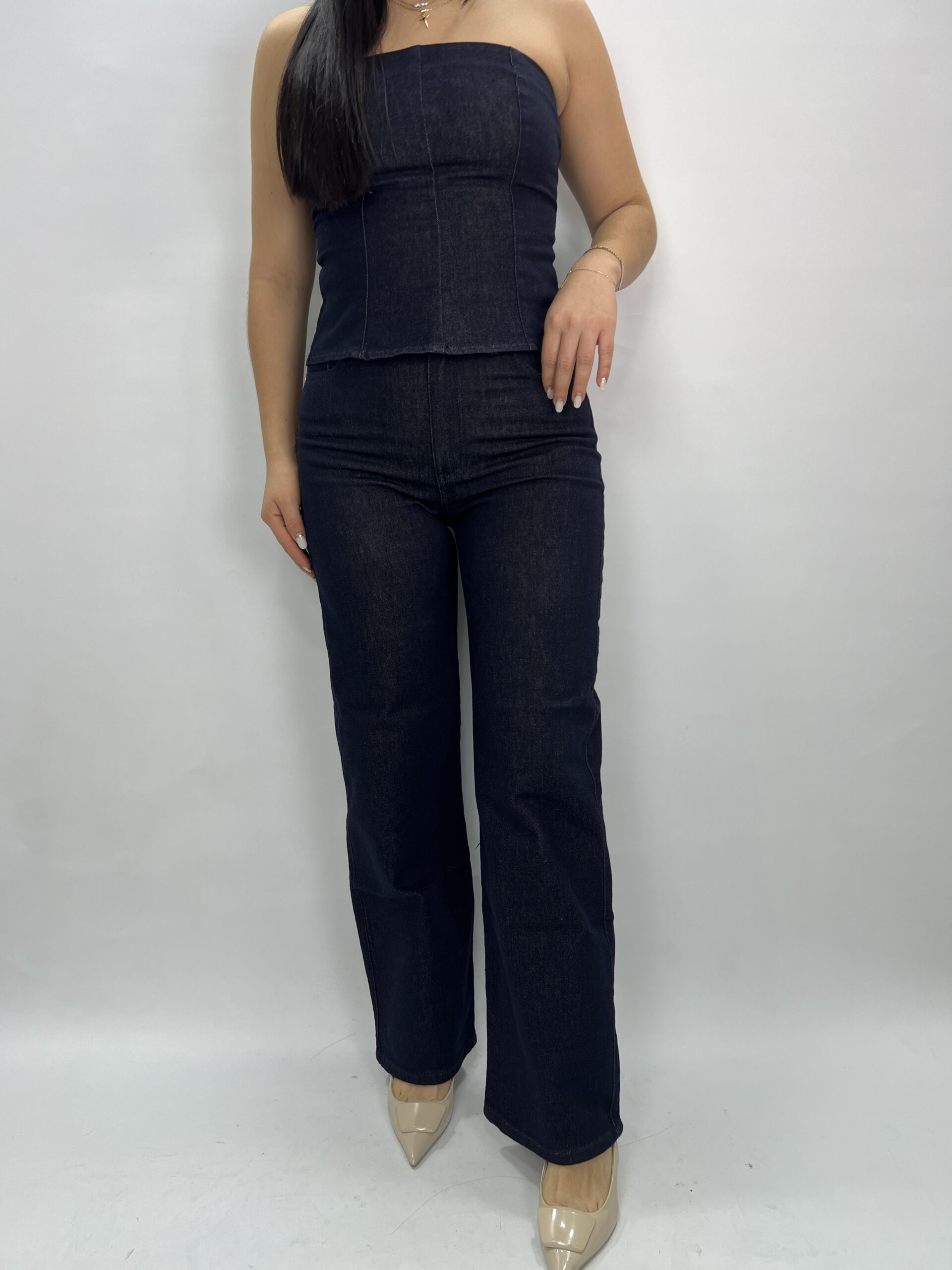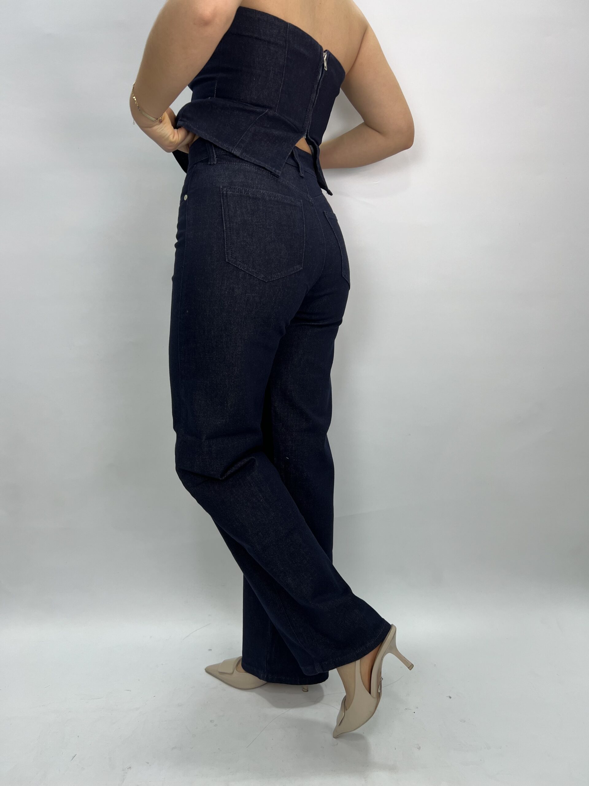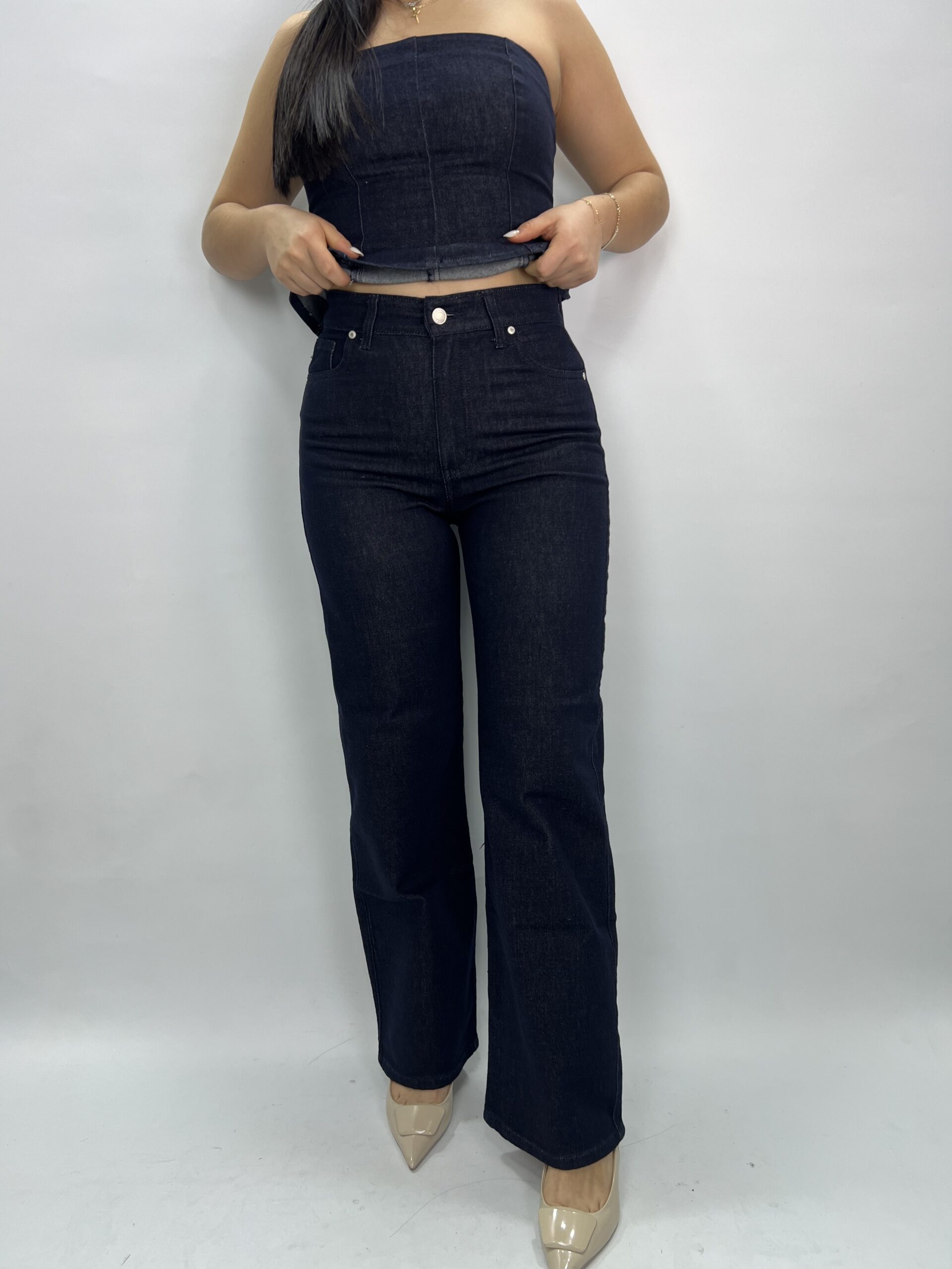 Jean recto, tiro alto, color azul oscuro, tela stretch 100% algodón, corte recto, pierna holgada y larga.