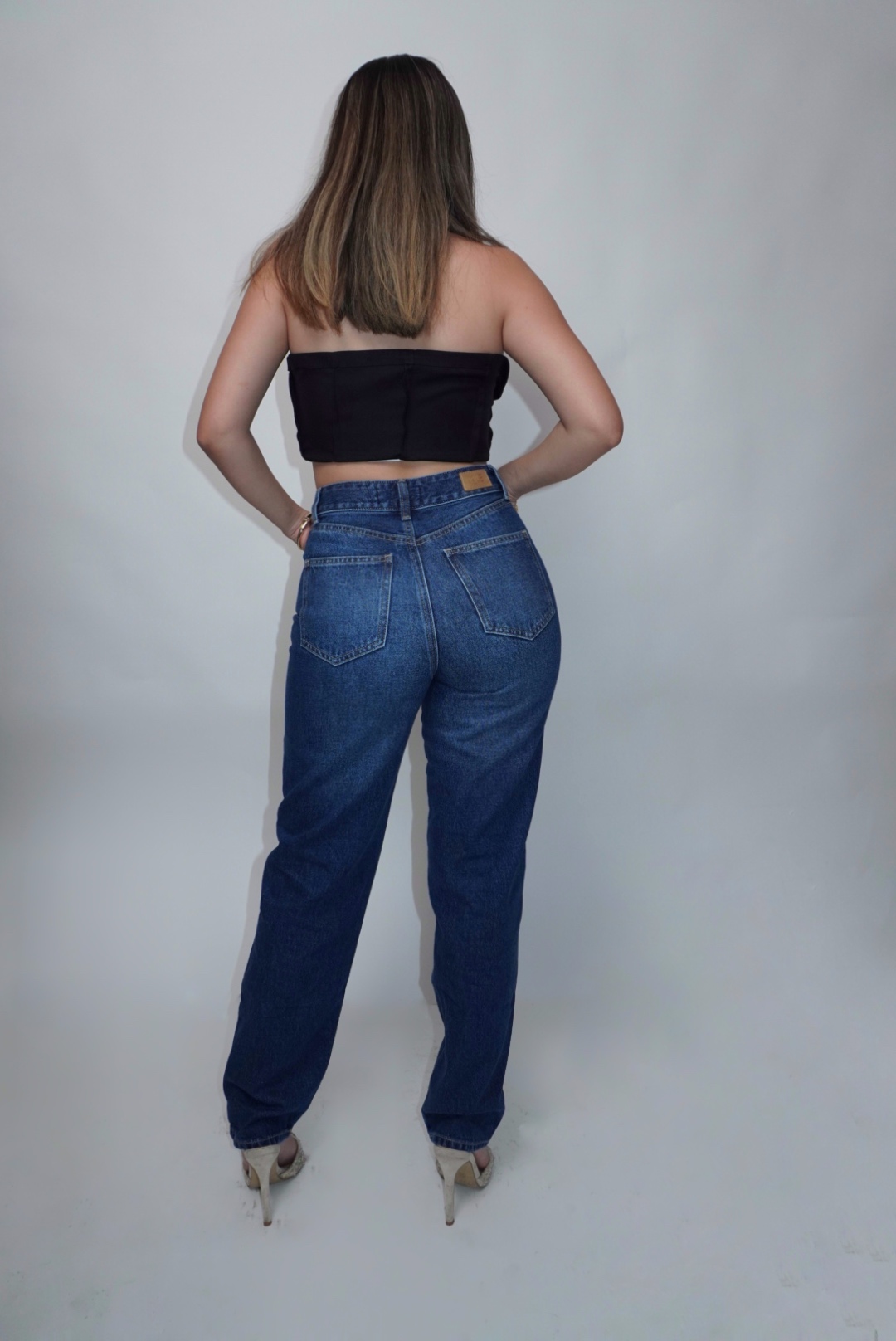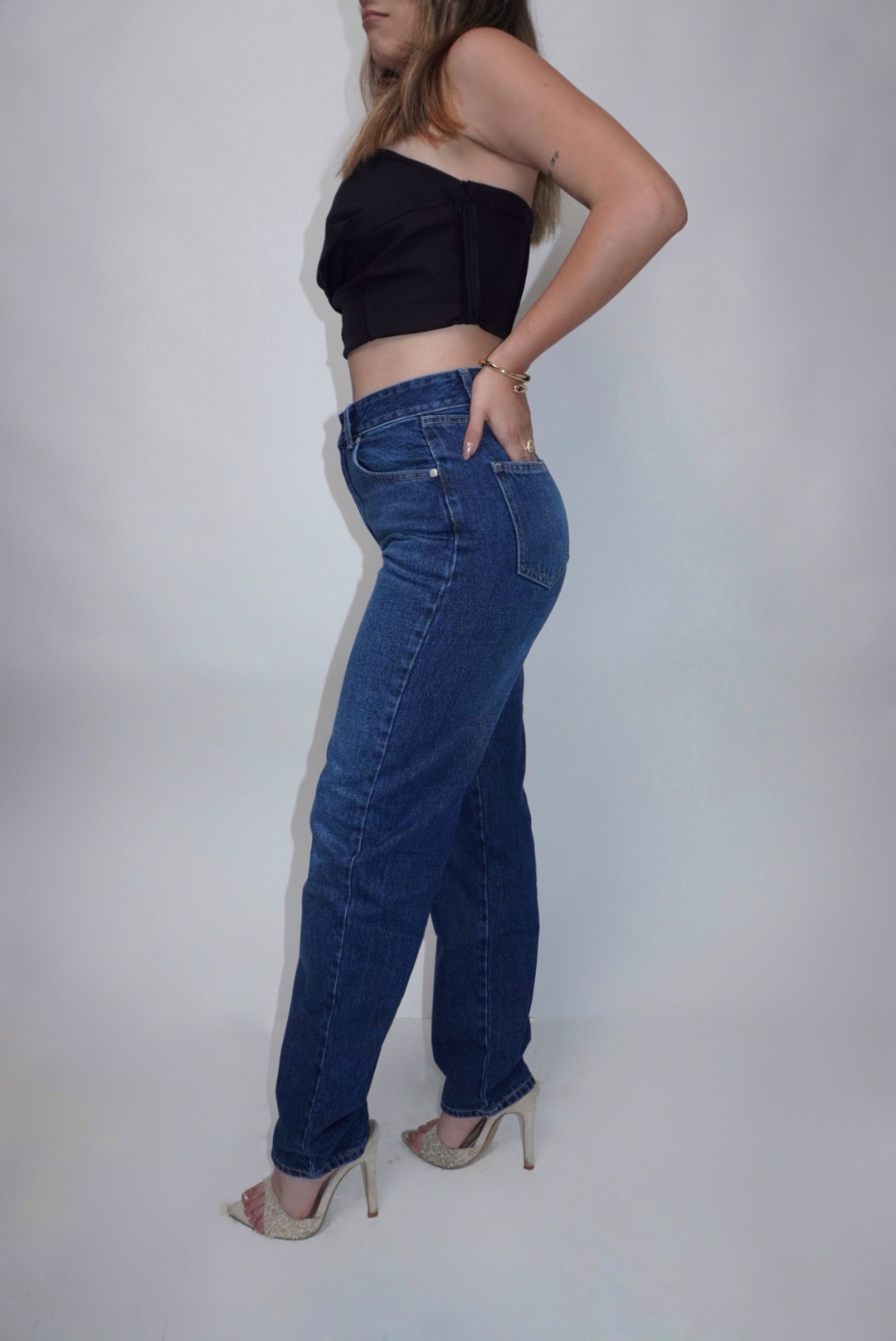 Mom Jean en tela rígida y tiro alto. Diseño en basta semitubo y ceñido en caderas.