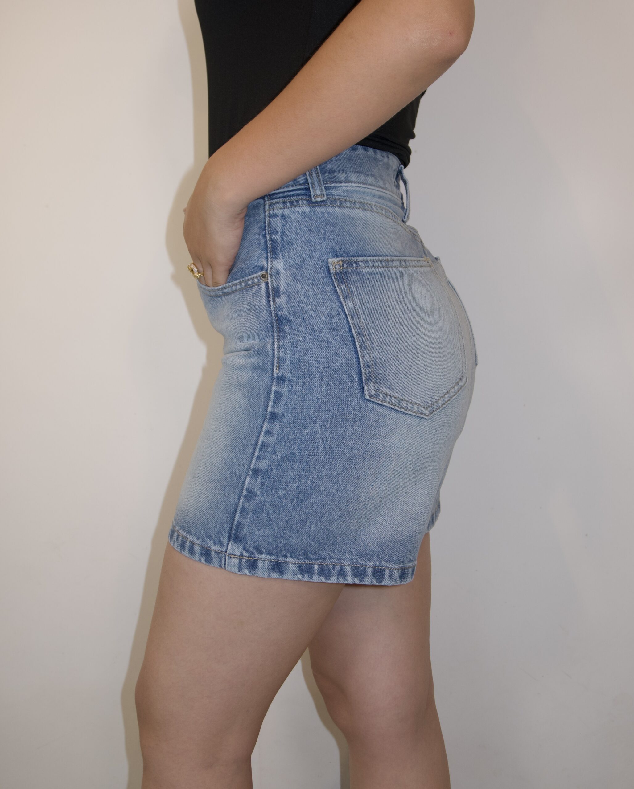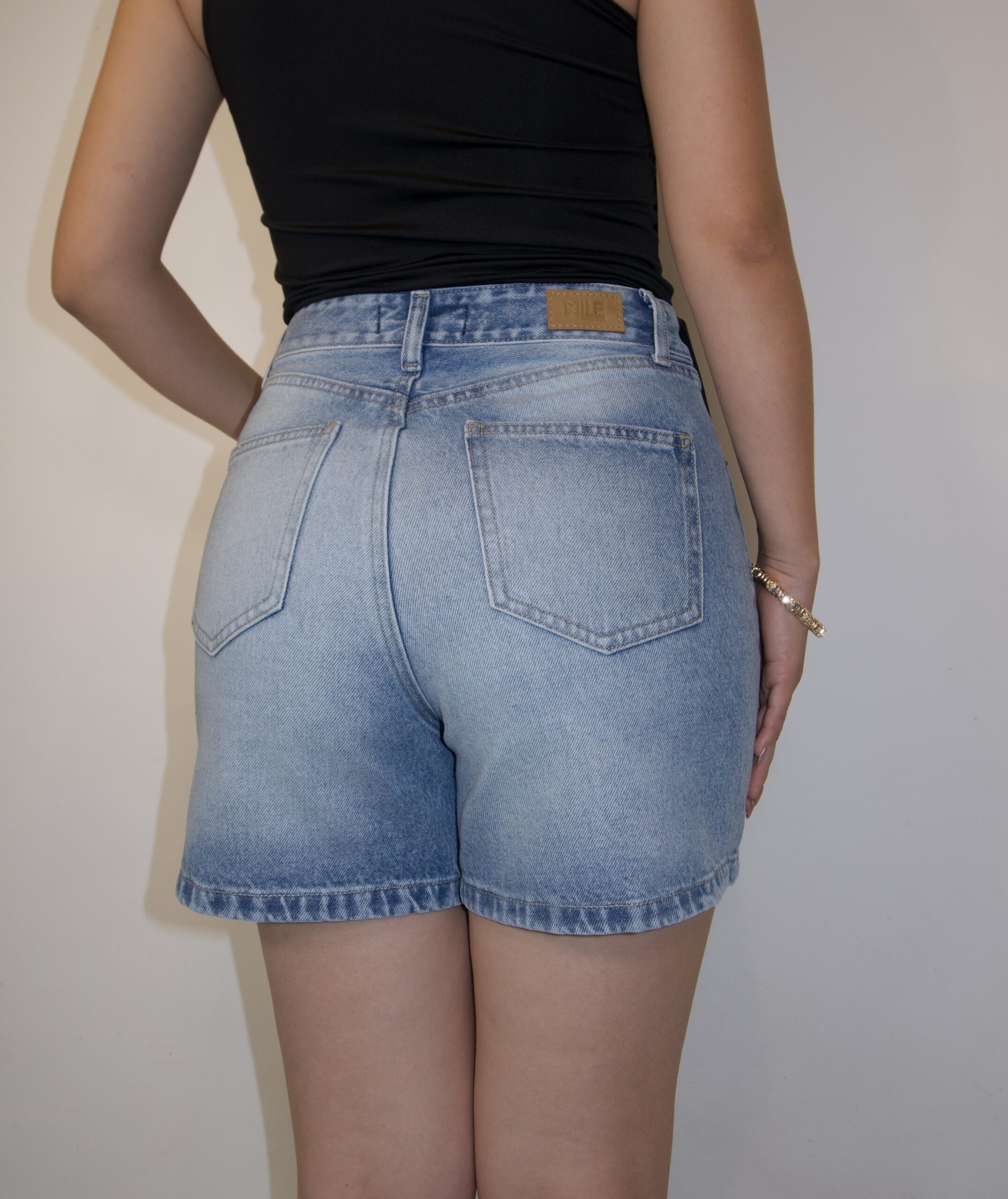 Mom short en tela rígida y corte tipo A. Tiro alto estilo holgado.