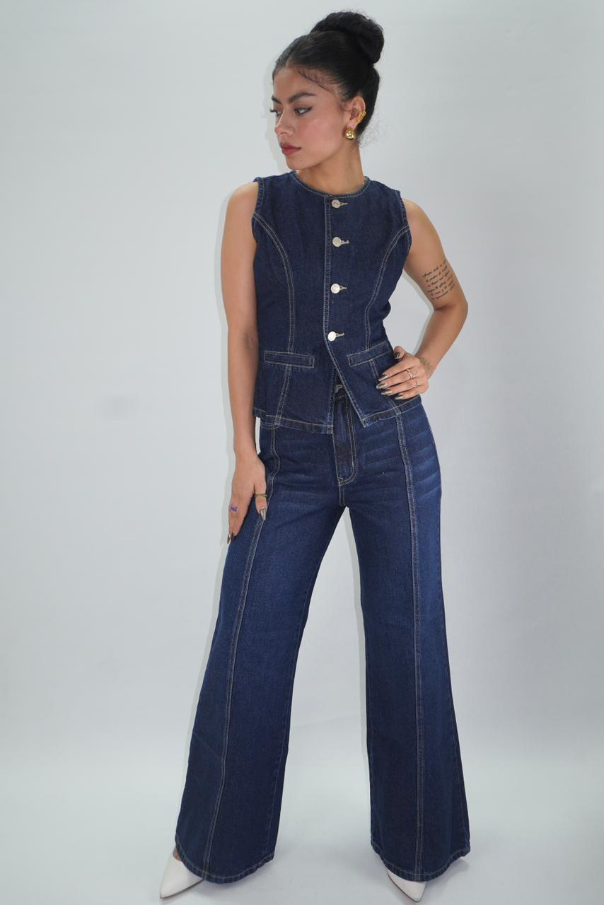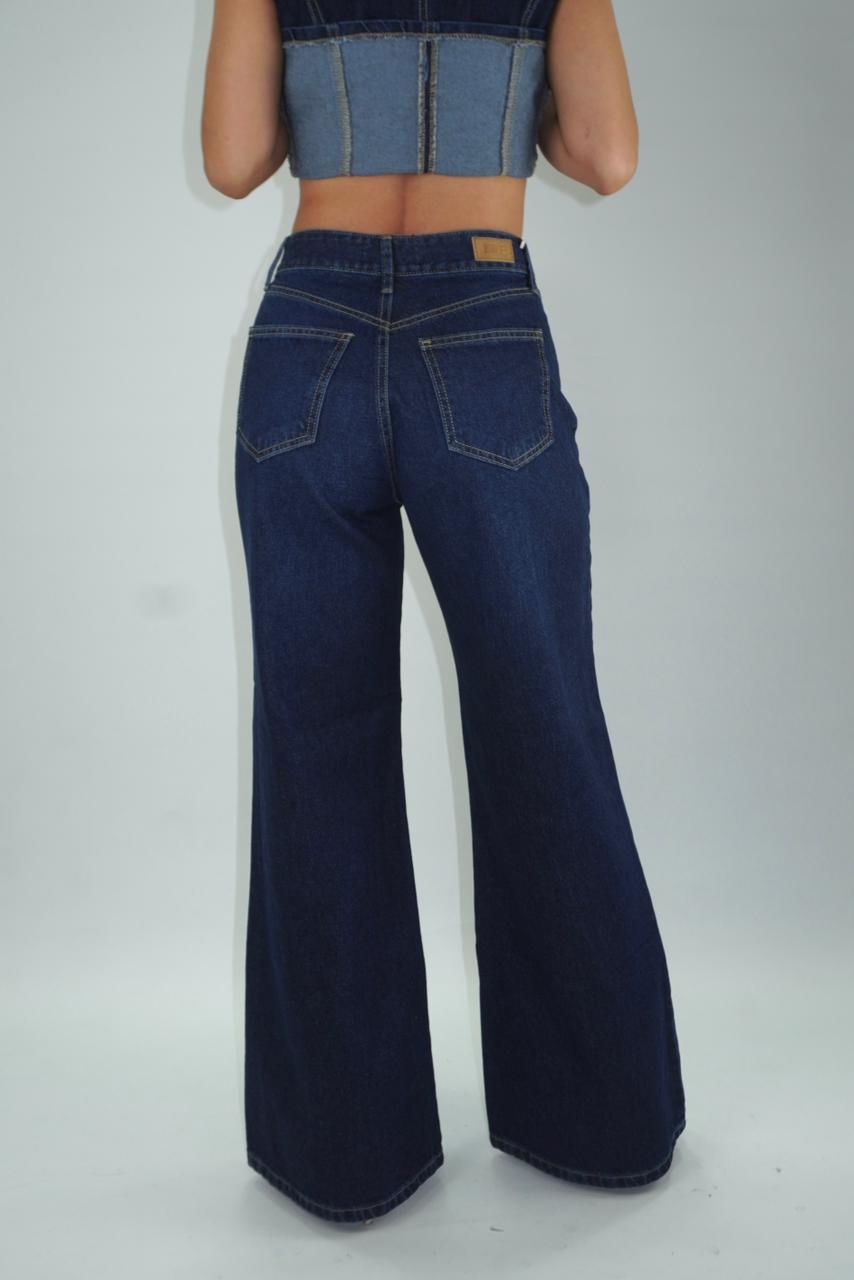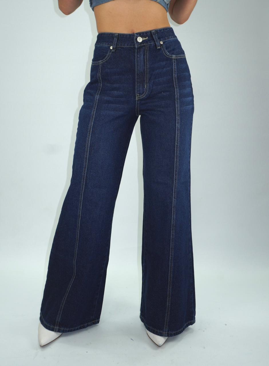 Palazzo jean, silueta amplia y elegante, tiro alto, color azul oscuro, tela rígida 100% algodón, pierna holgada y larga con caída fluida, con detalle de costuras.