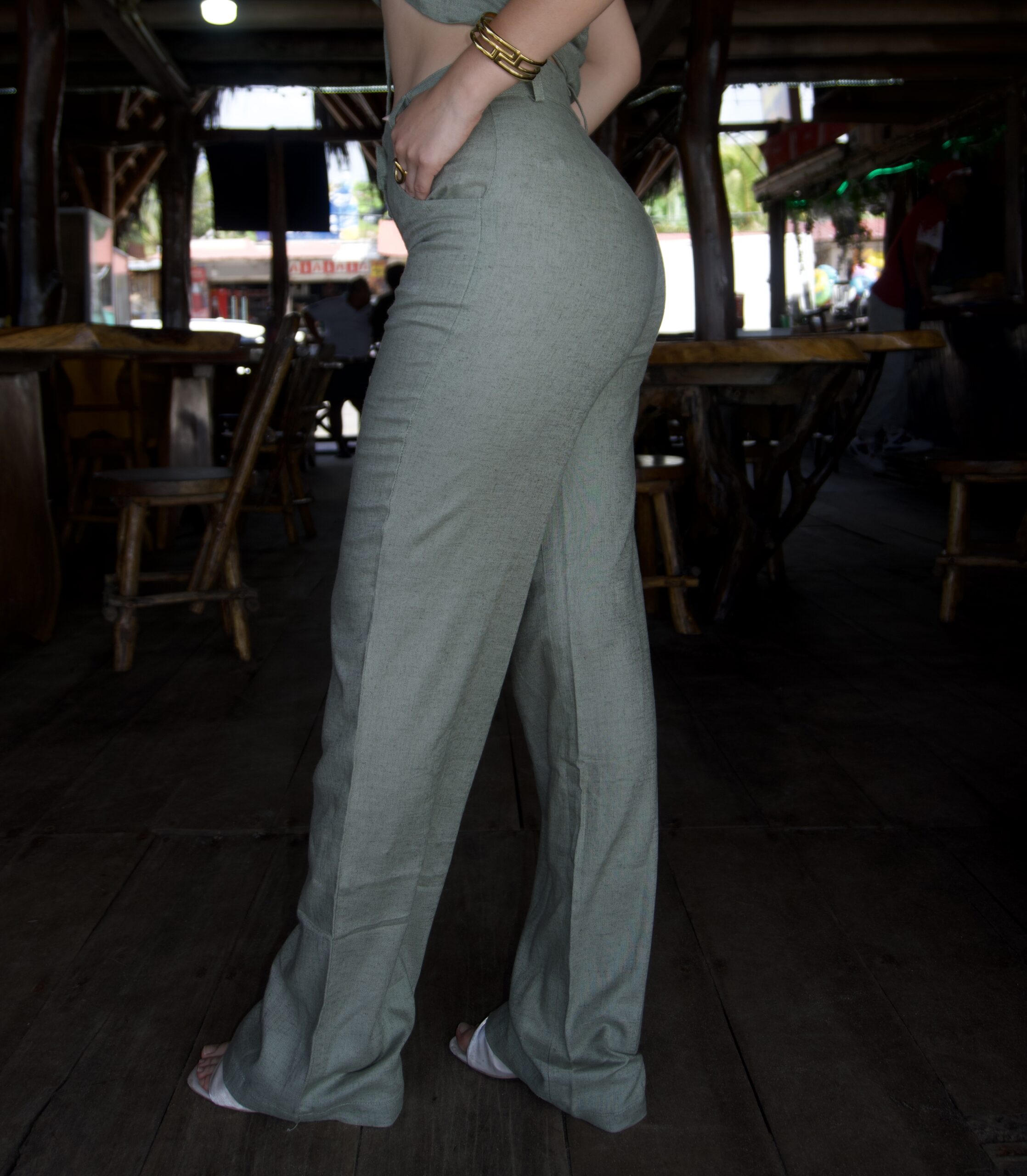 Pant en tela lino, tiro alto y corte recto. Cómodo y ligero.