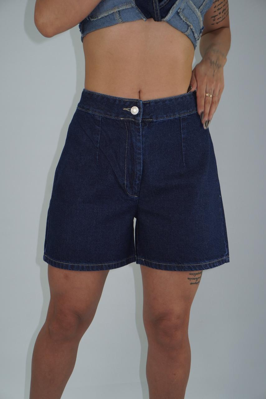 Short jean, azul oscuro, tela rígida, corte en A, estilo sueltito, con pinzas frontales y traseras.