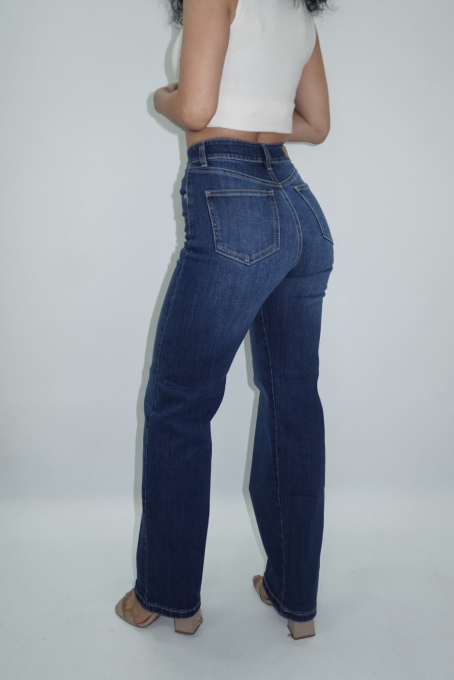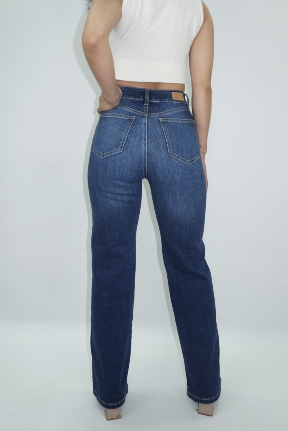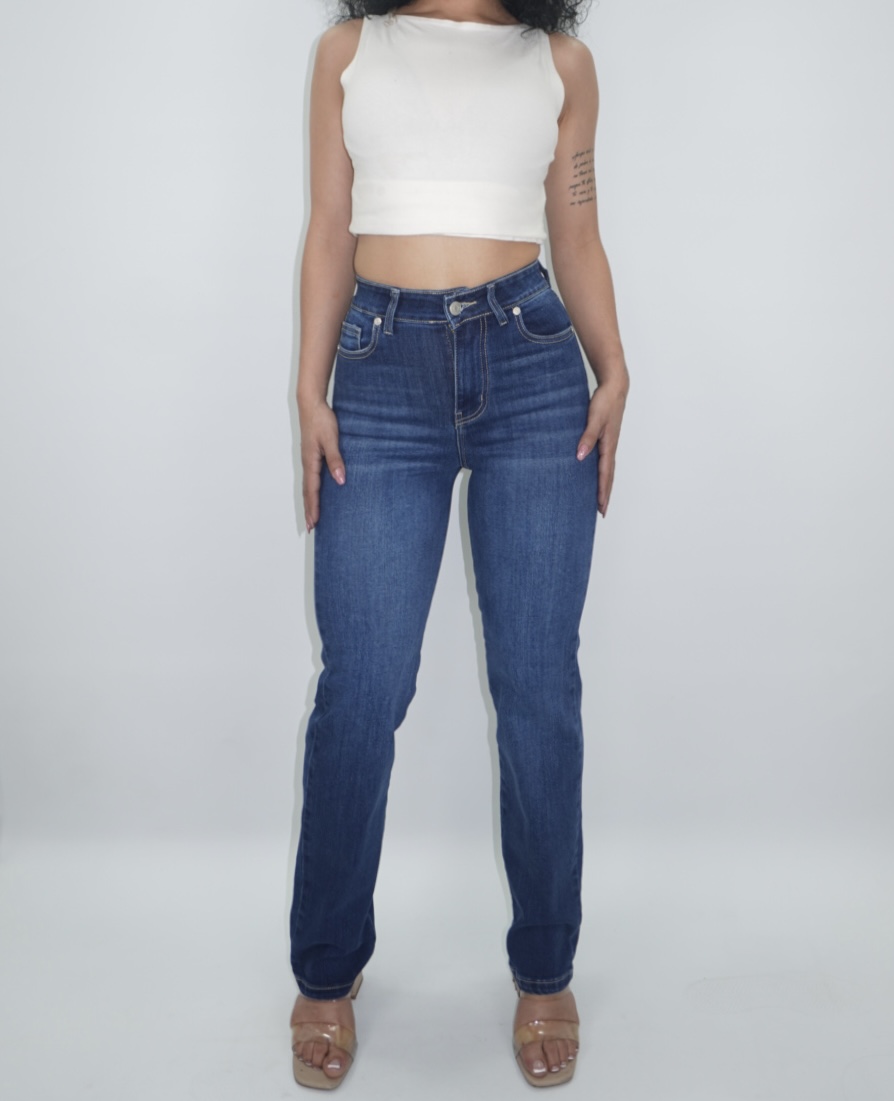 Slim Fit en color azul medio tela stretch, ceñido en cintura y cadera, basta semitubo y tiro alto.