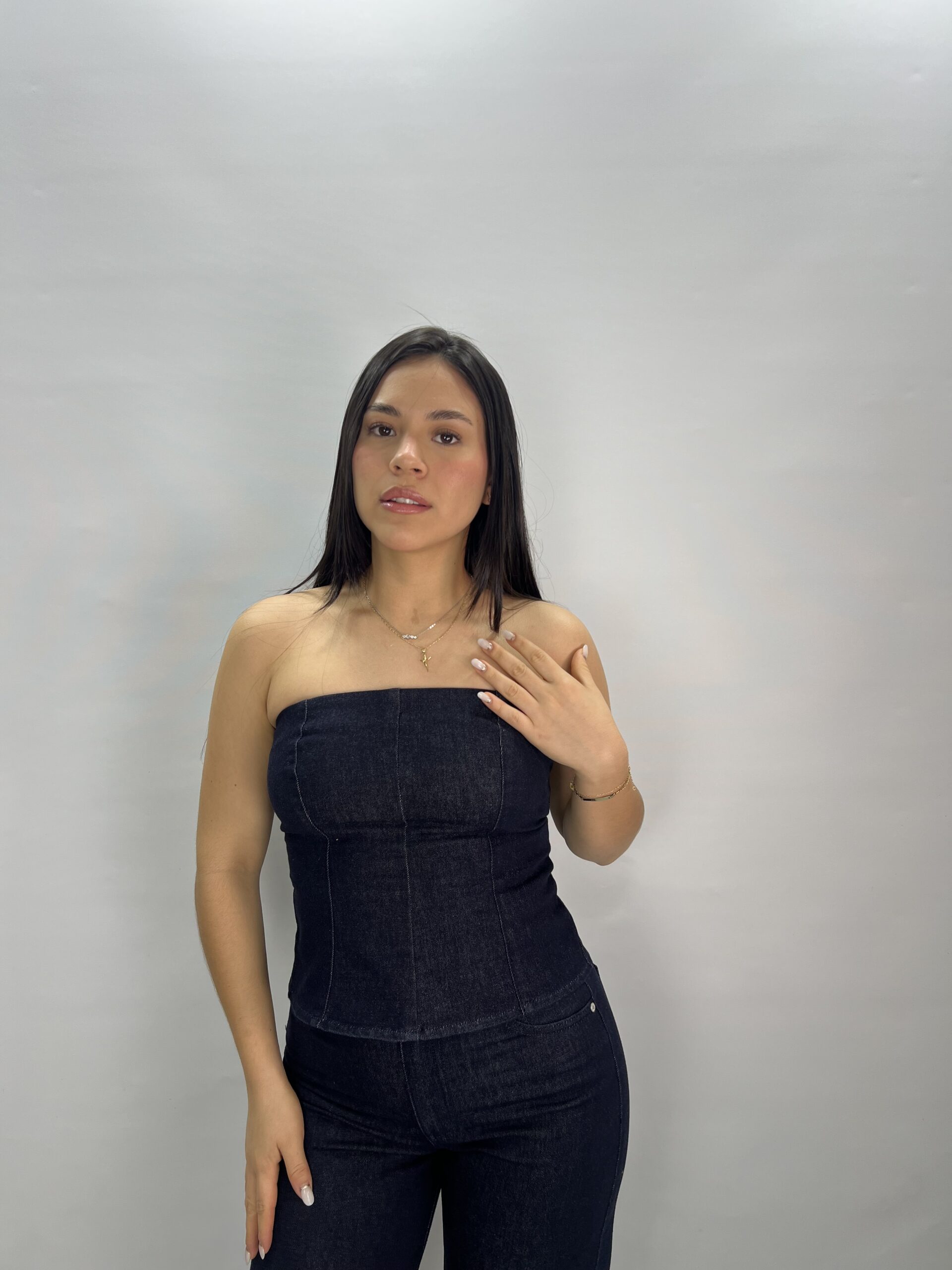 Top denim, strapless, con pinzas para mayor ajuste, color azul oscuro, con cierre en espalda.