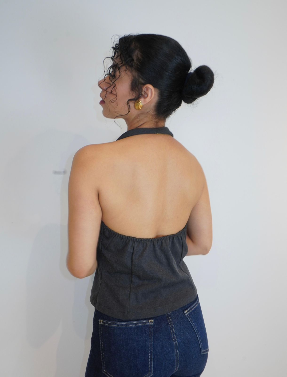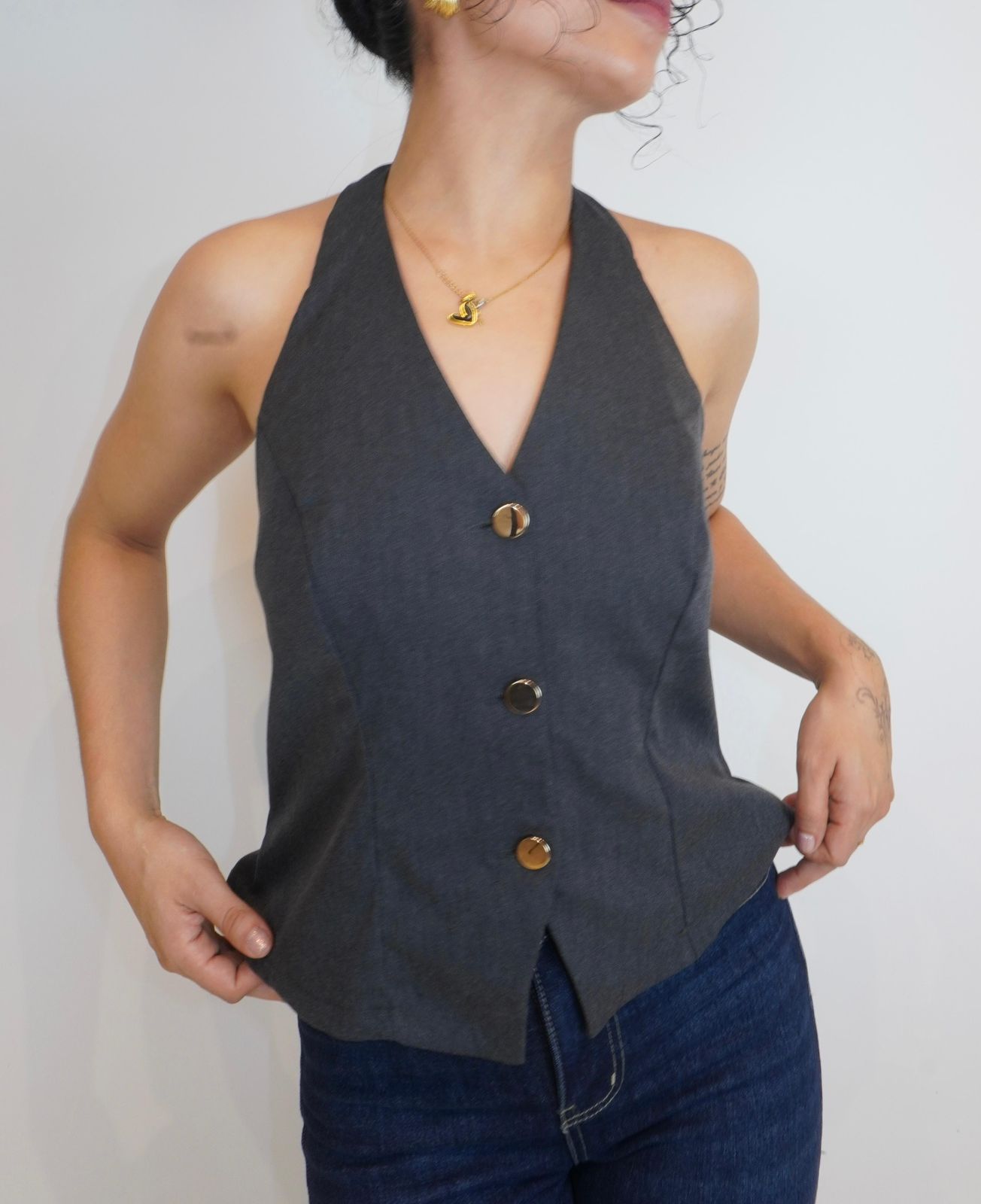Vest en color gris, tela casimir en estilo backless. Con pinzas para mayor ajuste.