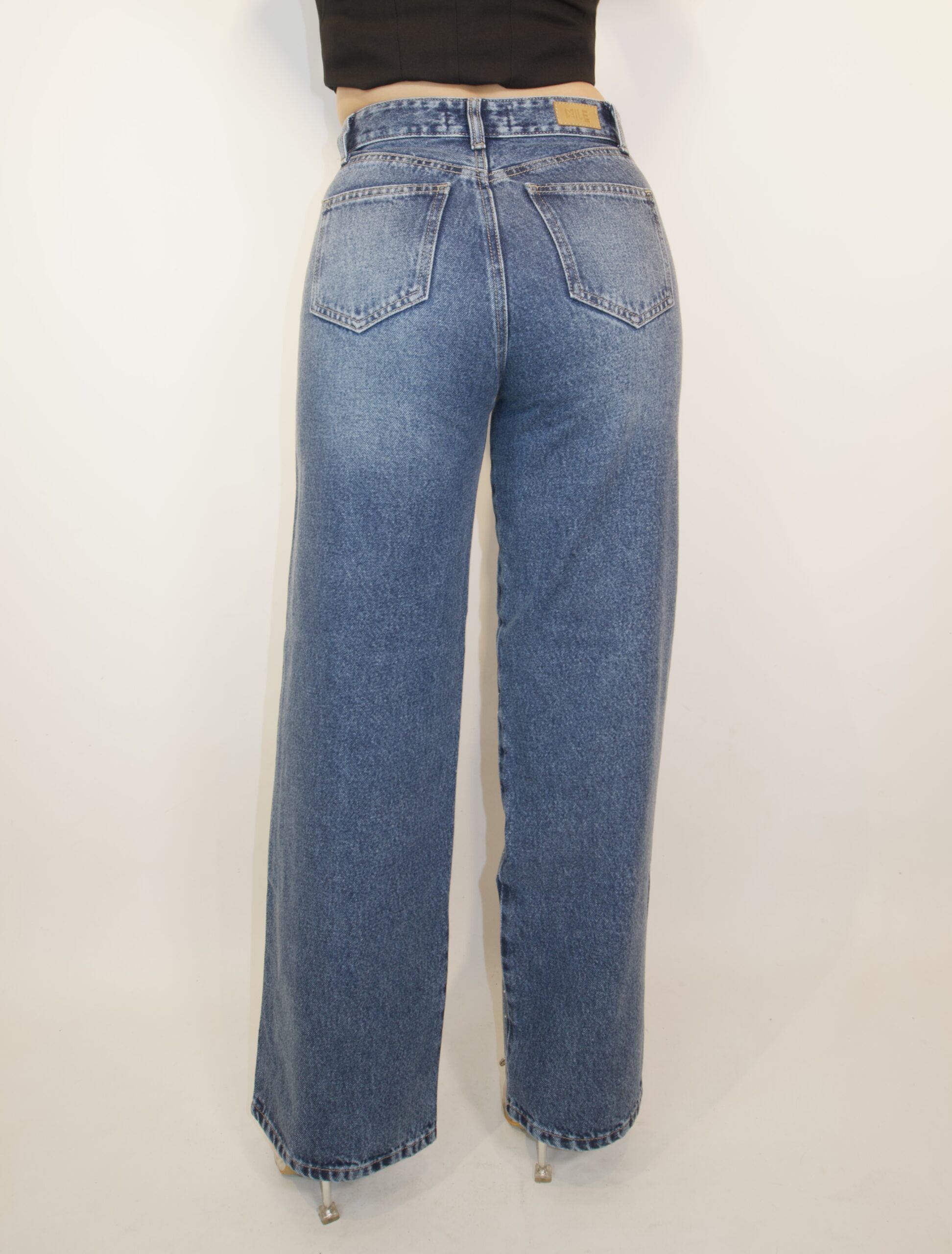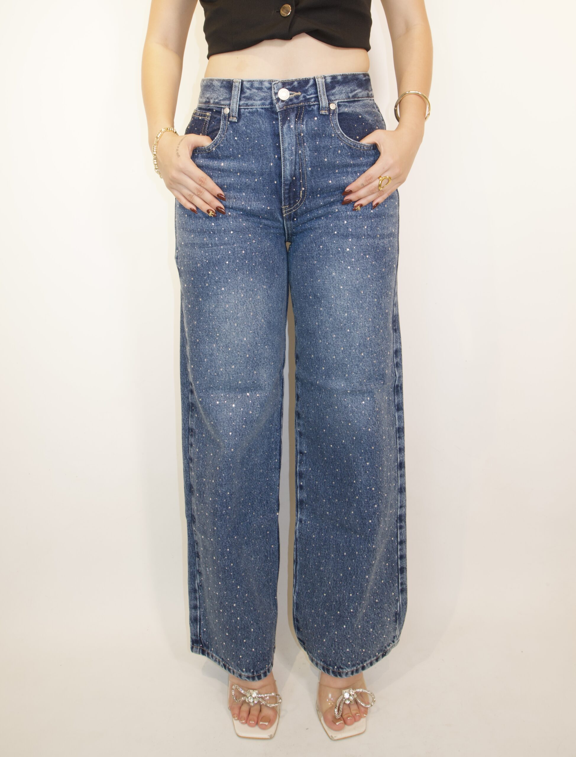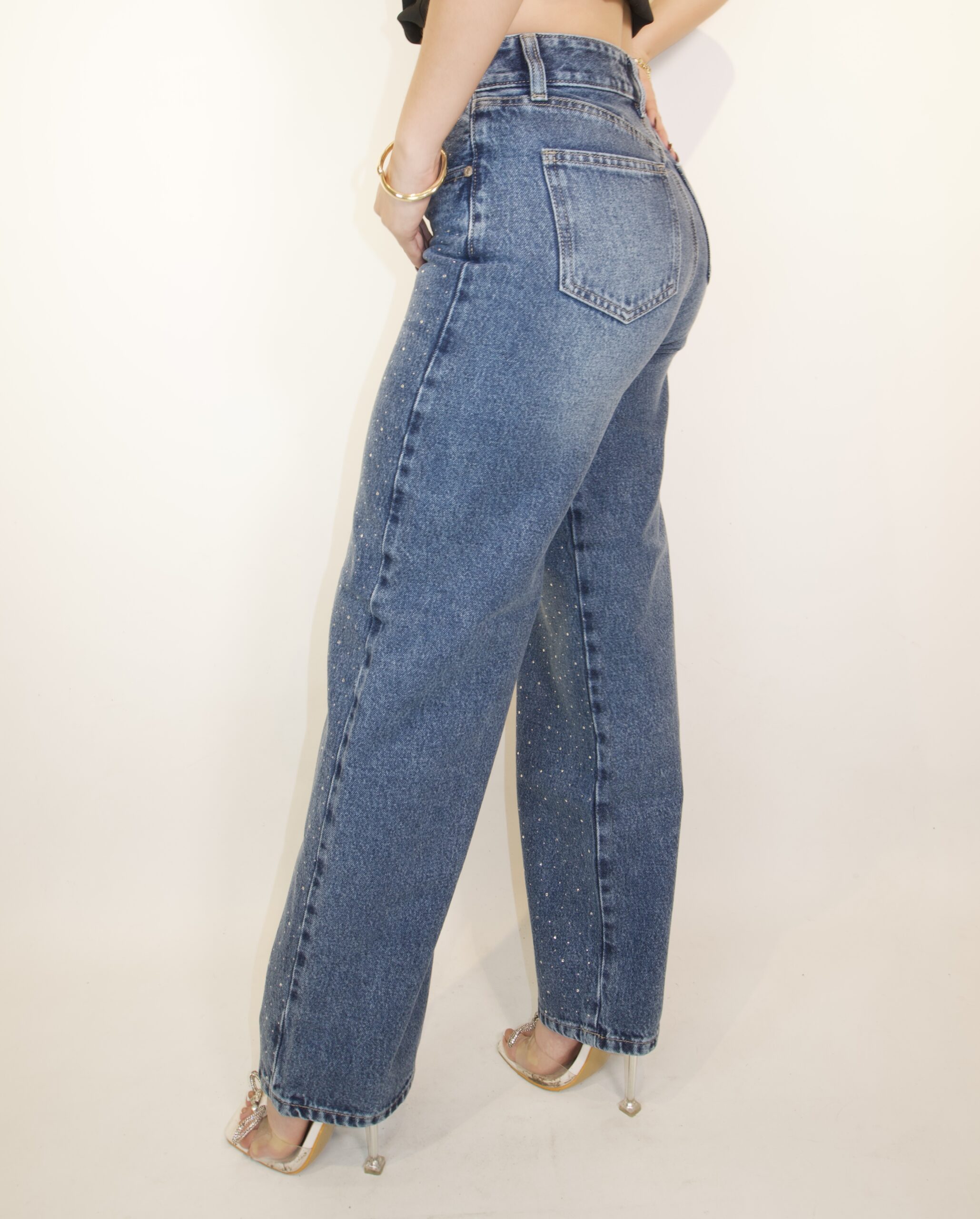 Wide Leg en tono azul oscuro, con detalle de brillos aplicados en la parte delantera. Jean en tiro alto y tela rígida.