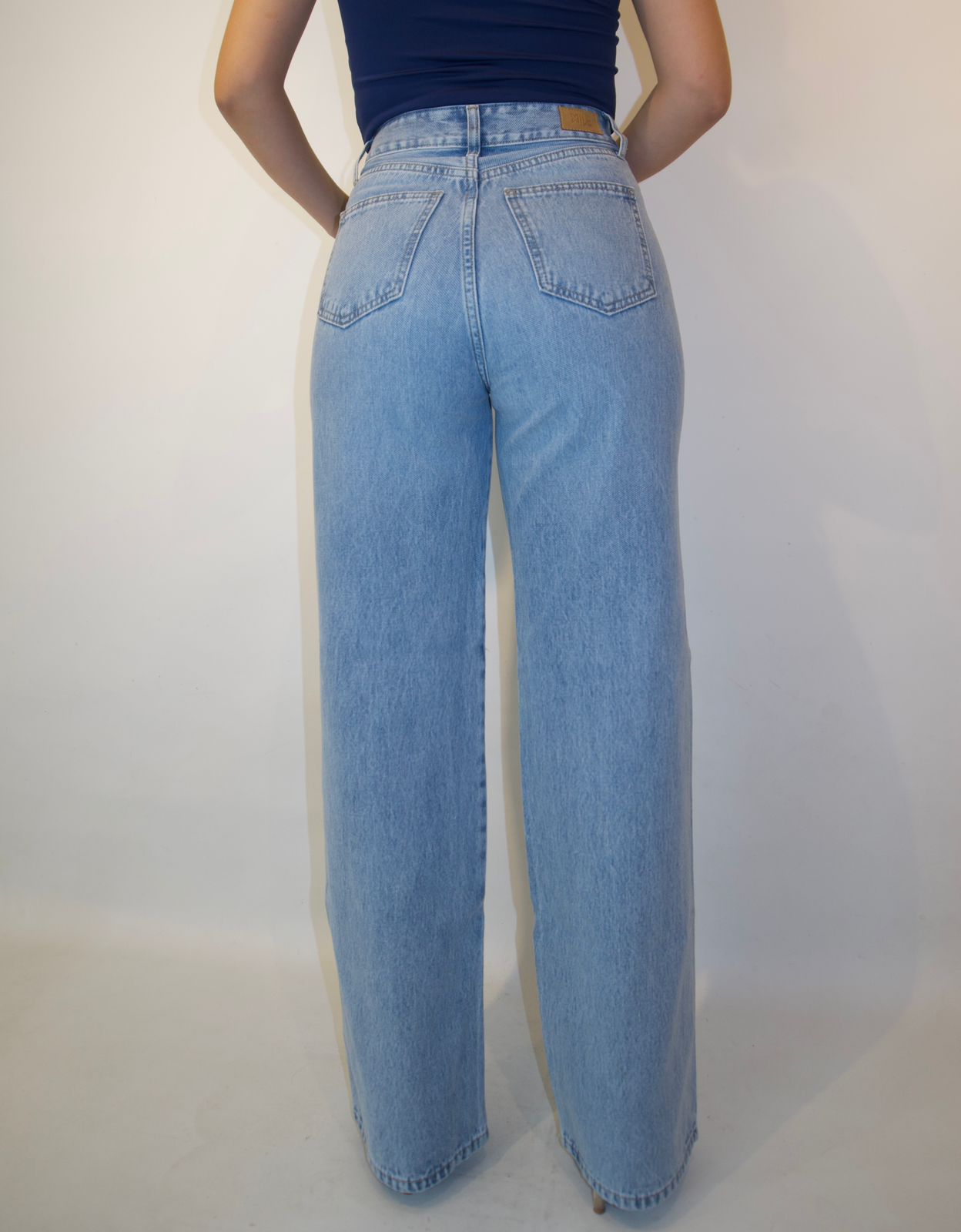 Wide Leg Jean en azul claro con regulador interno, reduce hasta 6 cm en cintura