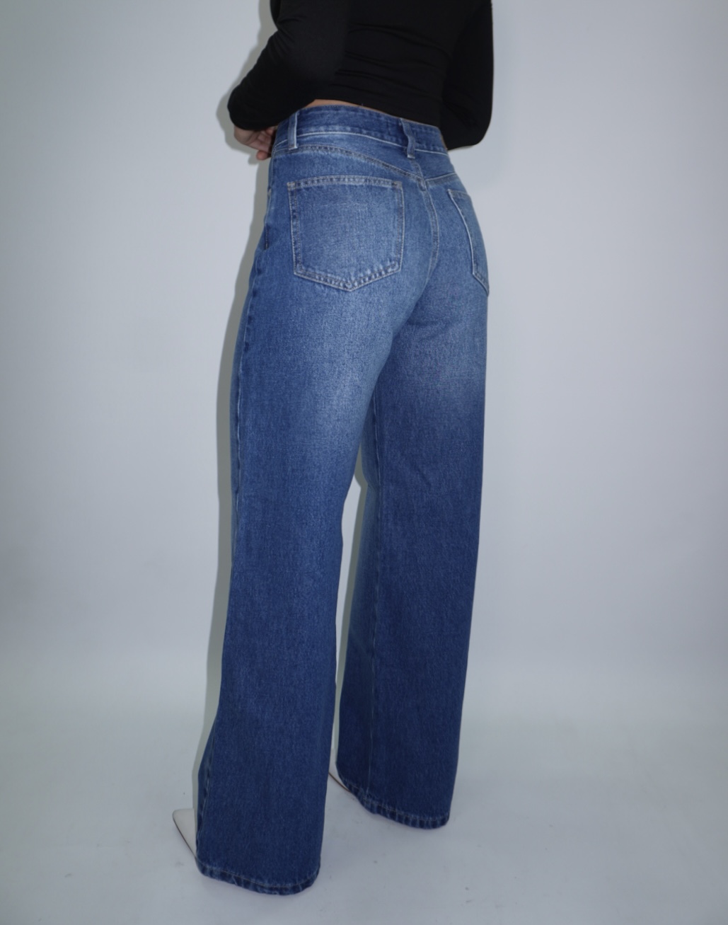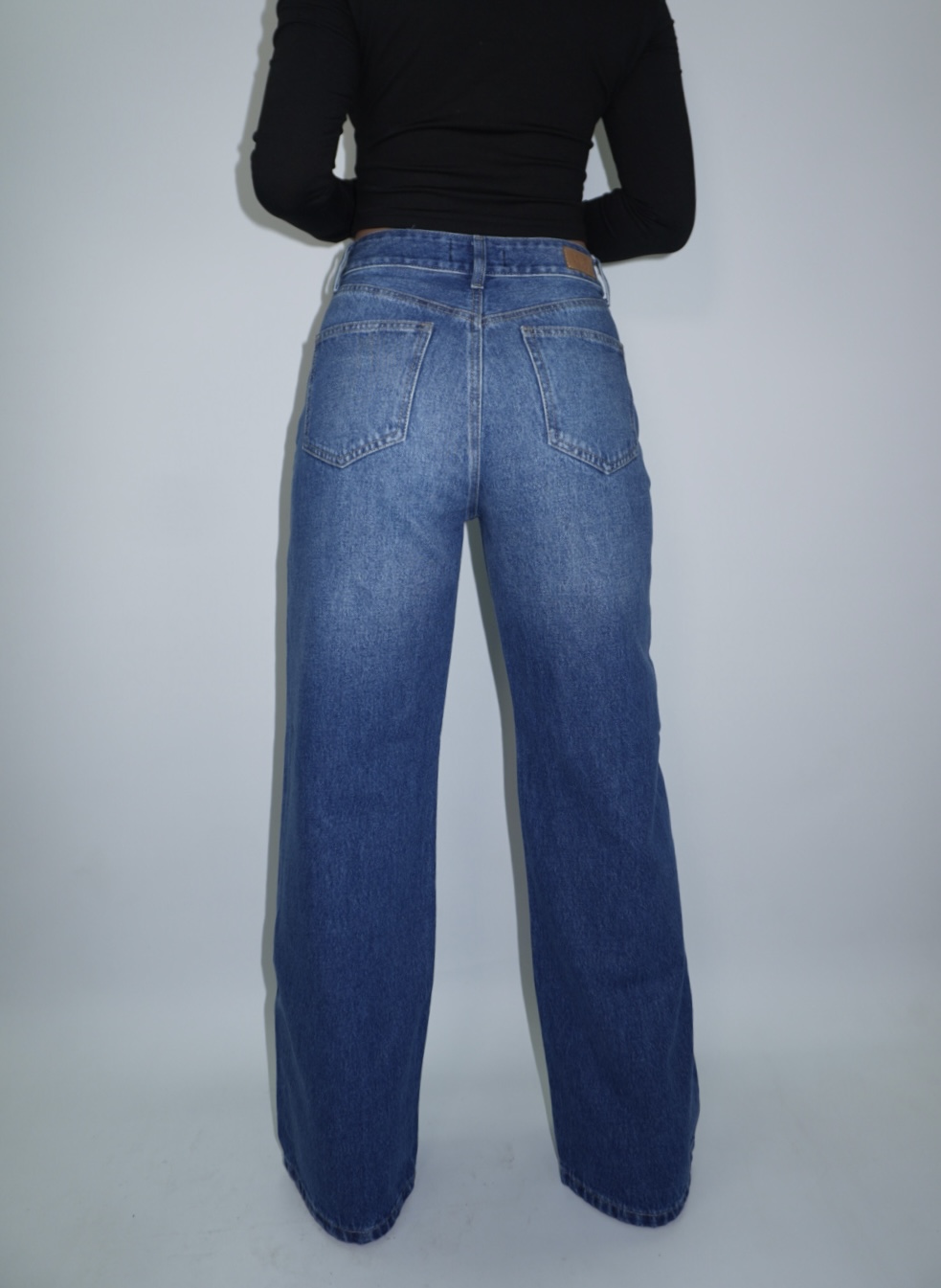 Wide Leg Jeans en azul medio , tiro alto y tela rígida. Corte recto y largo.