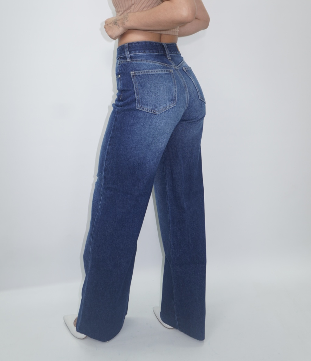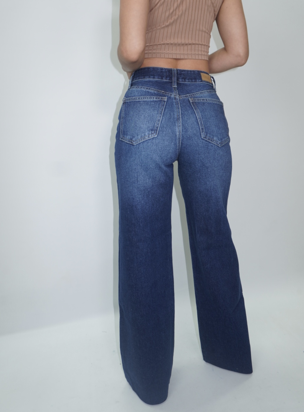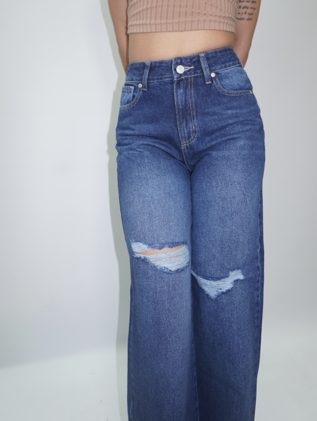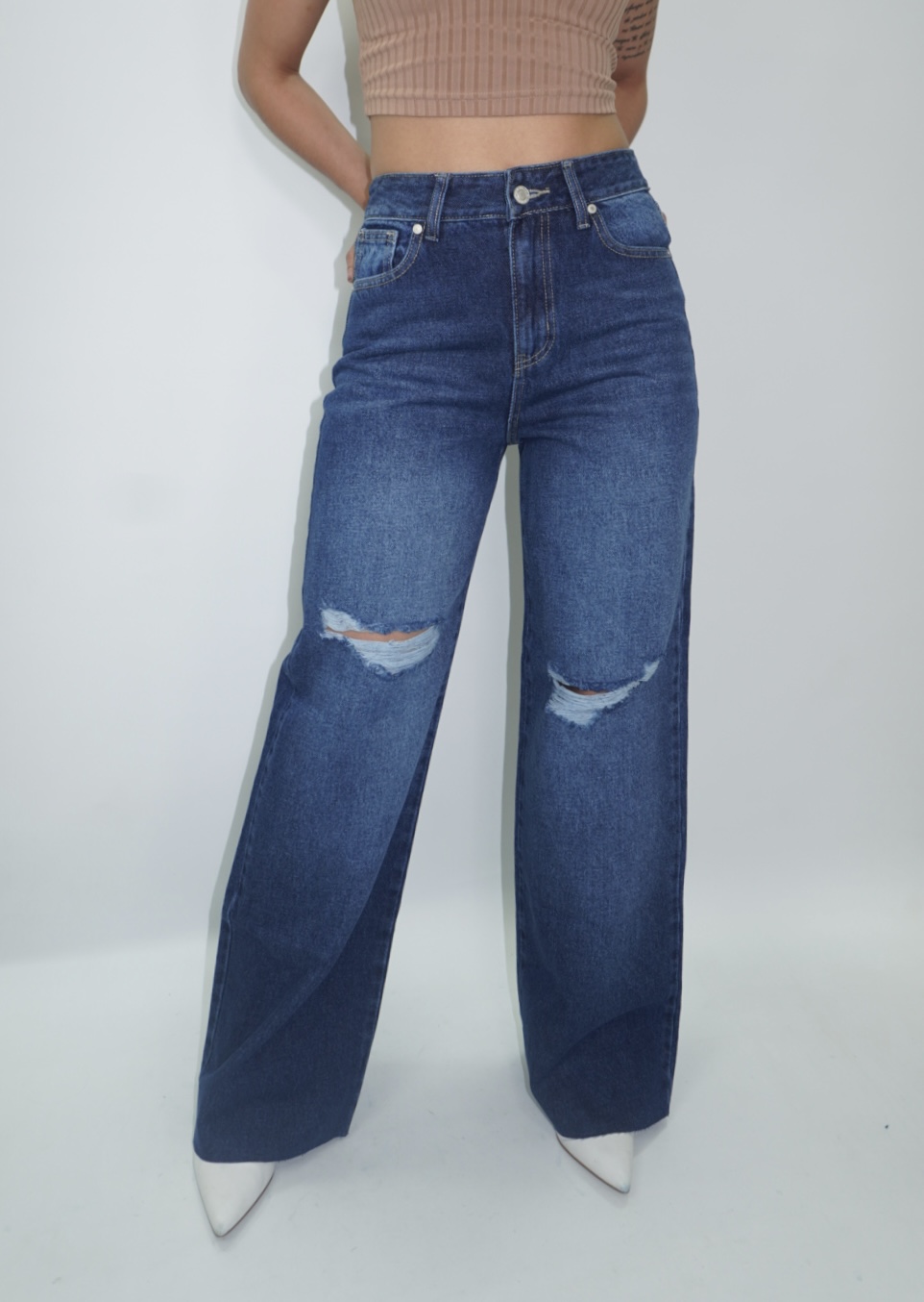 Wide Leg Jeans en azul oscuro , con detalles rasgado y basta “cropped” en tiro alto y tela rígida. Corte recto y largo.
