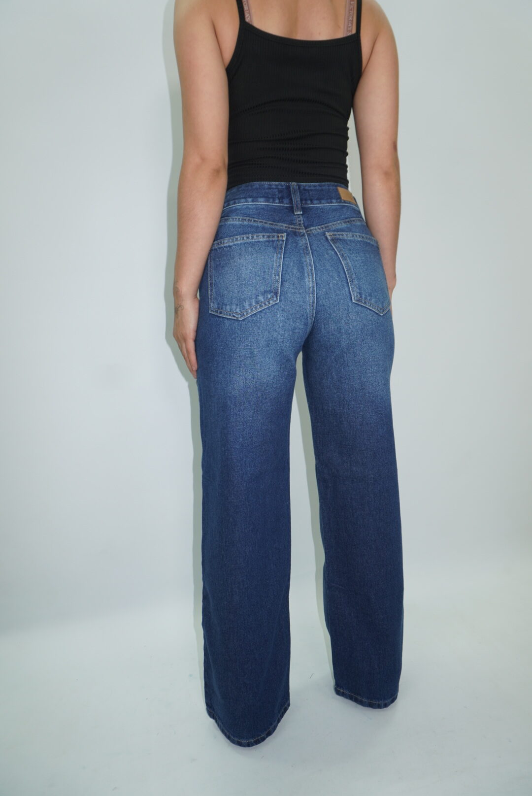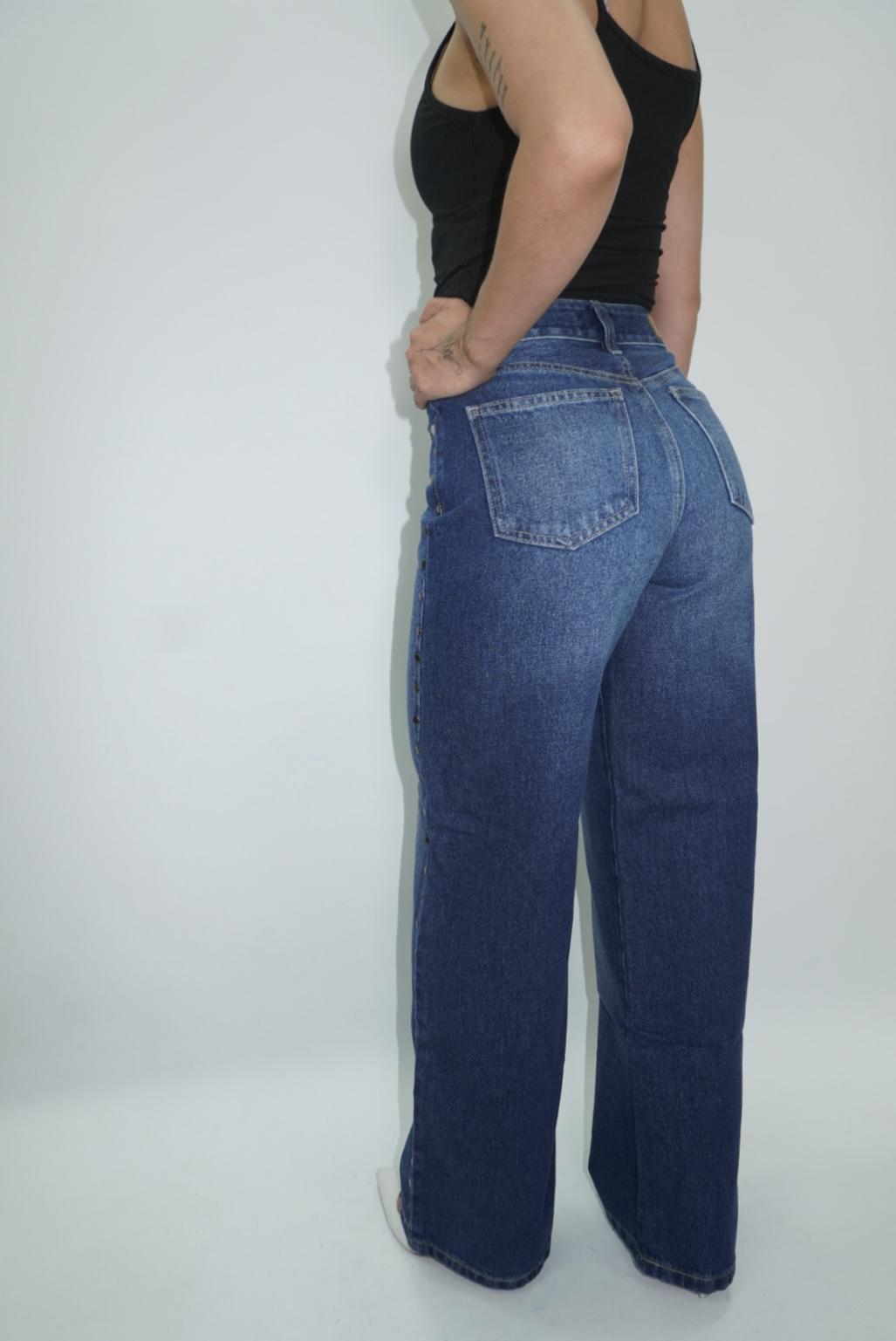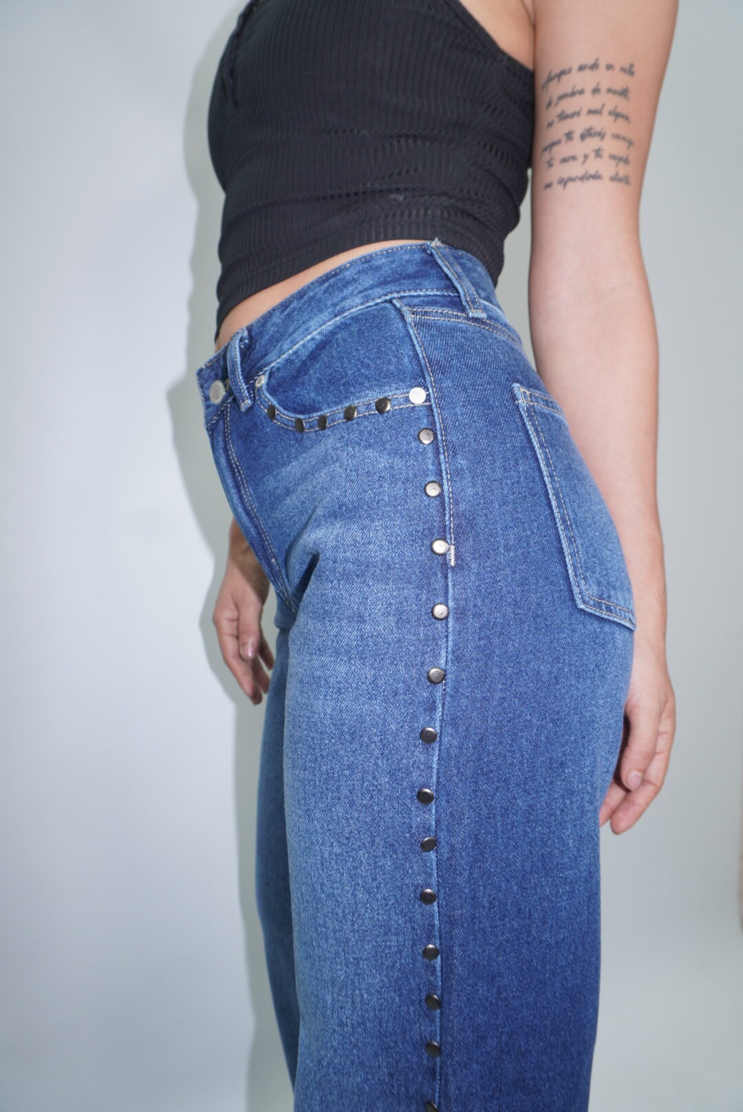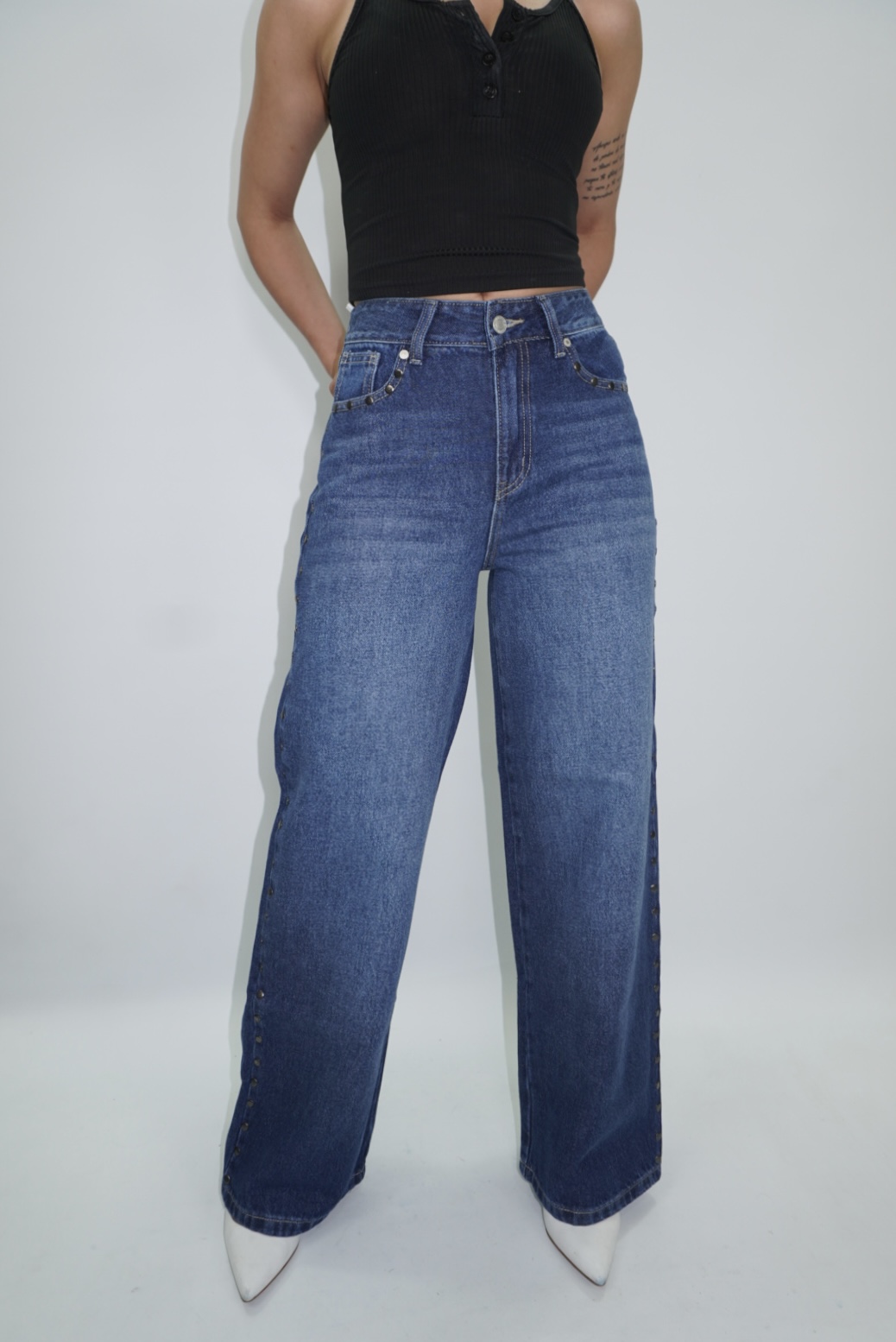 Wide Leg en azul oscuro con detalle de tachuelas plateadas en costados y bolsillos, tiro alto y tela rígida.