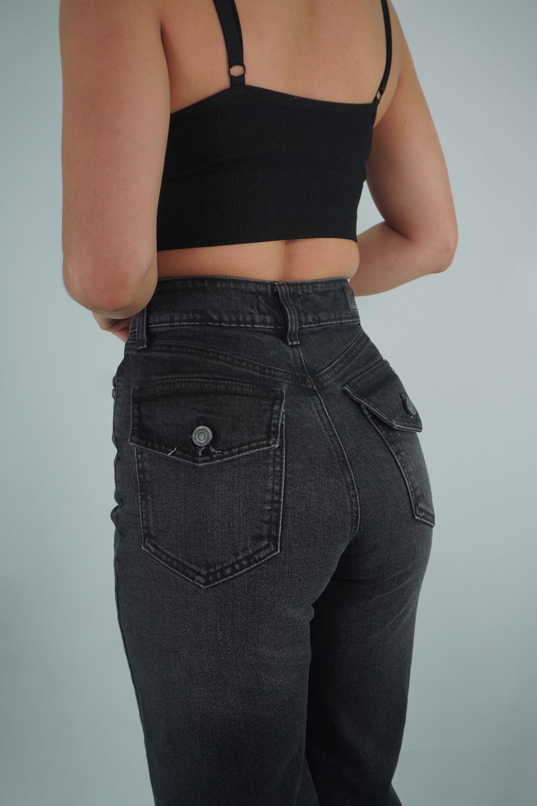 Jean wide leg negro, tiro alto, costuras color negro, tela confort, su composición es entre tela stretch y rígida, pierna holgada y larga, con detalle de bolsillo trasero tipo tapa.