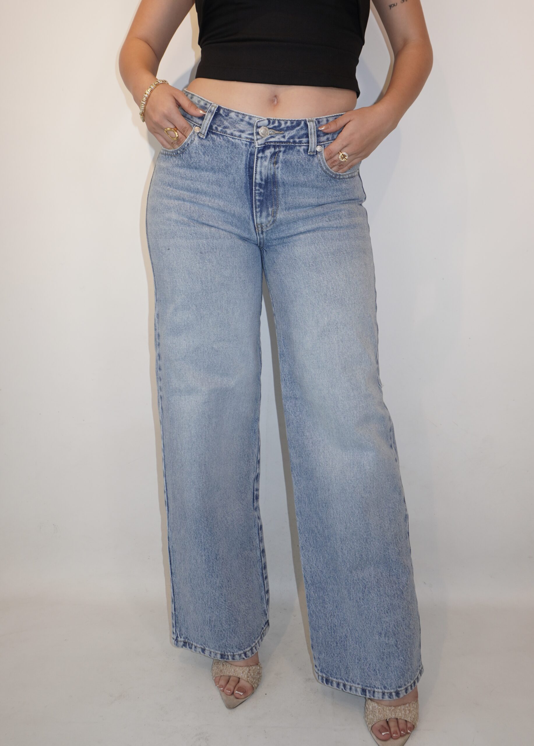 Wide Leg Jean en azul claro. Tiro medio y en corte recto y largo.